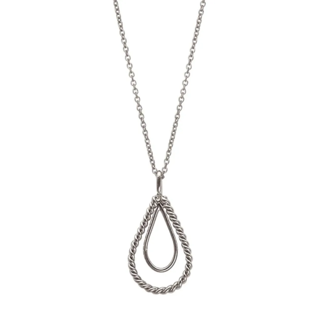 Dette smukke vedhæng er håndlavet i sterling sølv, som er rhodineret i overfladen så det er blankt og smukt. Vedhænger er designet som to, dråbeformet ringe, hvor den ene er glat og den anden er snoet. Vedhænget sælges eksklusiv kæde.