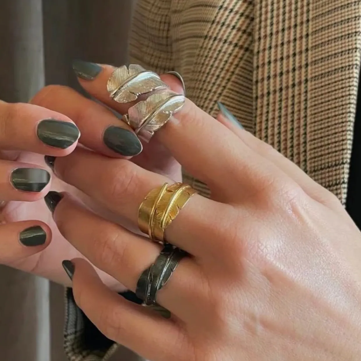 Den brede udgave af Fjer ringen gør den til et markant smykke, som både kan bæres alene som statement-ring eller kombineres med andre smykker for et personligt look.