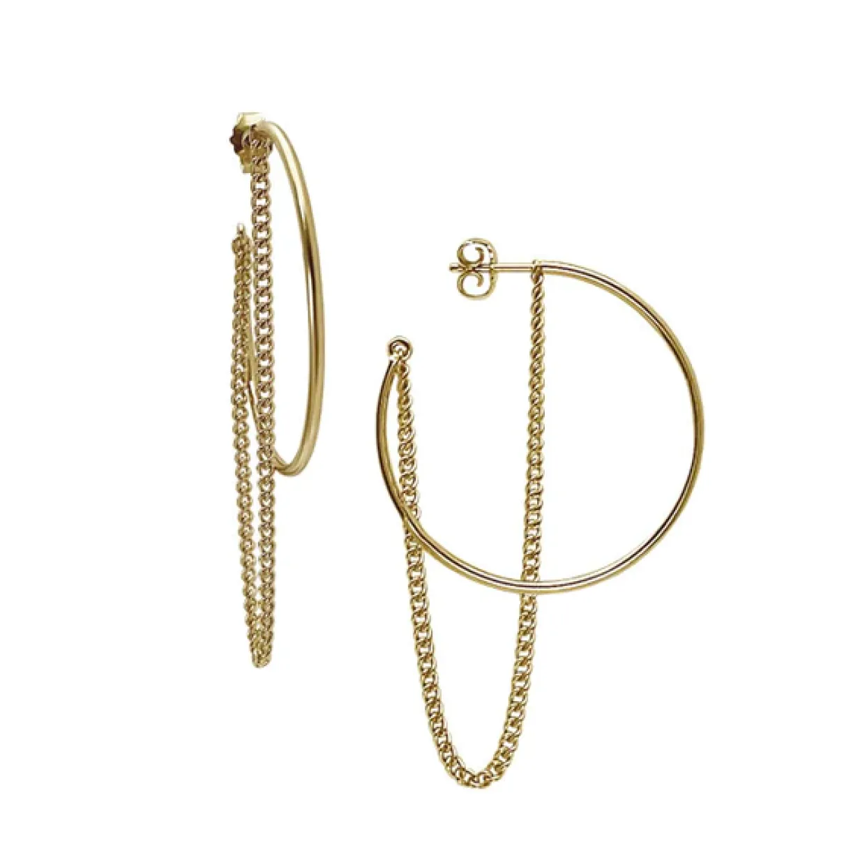 Disse flotte øreringe er fremstillet i guldbelagt sterling sølv. Øreringene er designet som halv creoler med ørestikkerer, og har en panser kæde på som sidder fast i start og slut af creolen. Creolen måler 25 mm i diamater.