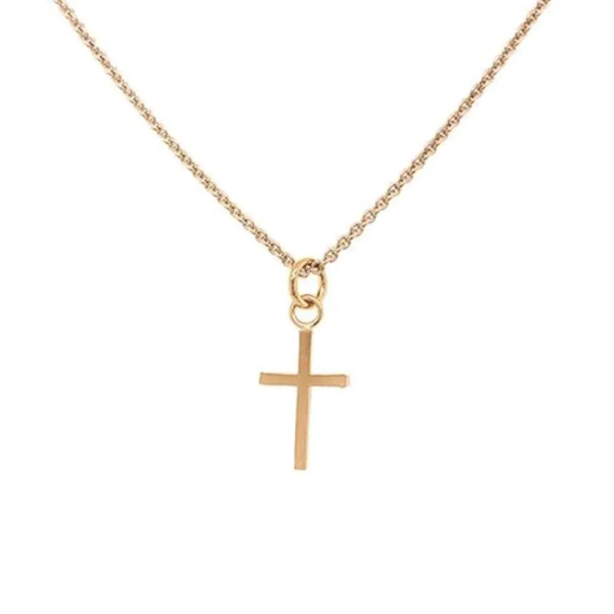 Dette enkle og klassiske kors er fremstillet i sterling sølv og forgyldt. Korset måler ca. 18 x 9 mm og leveres uden kæde.