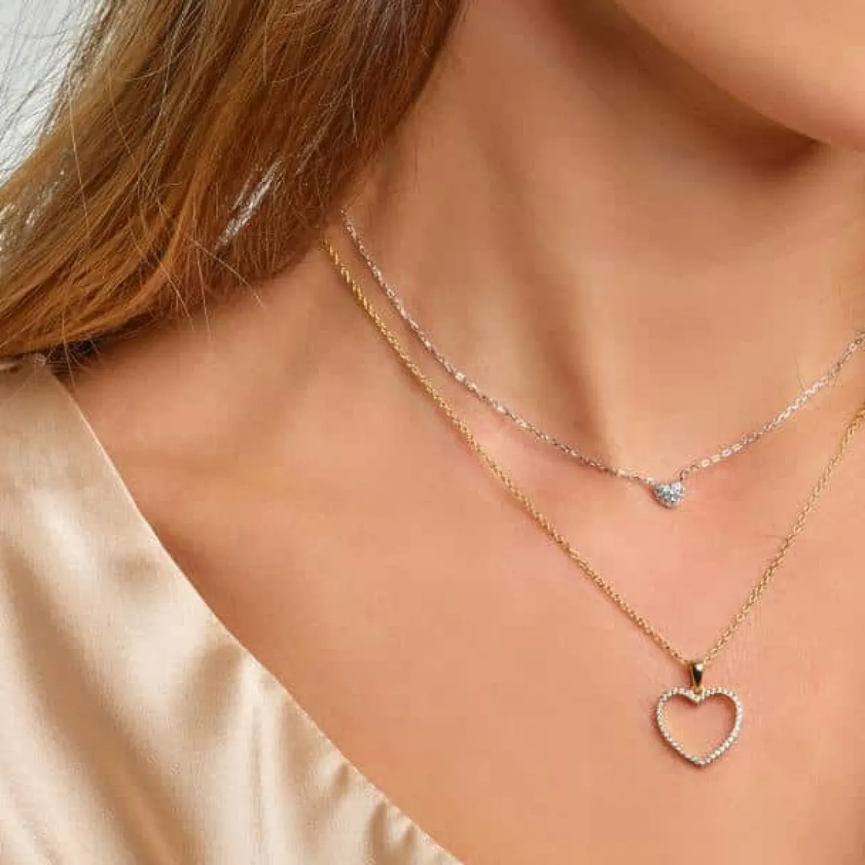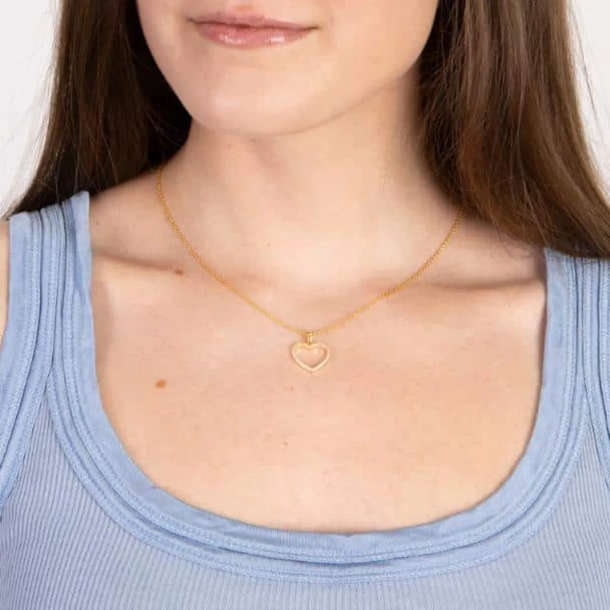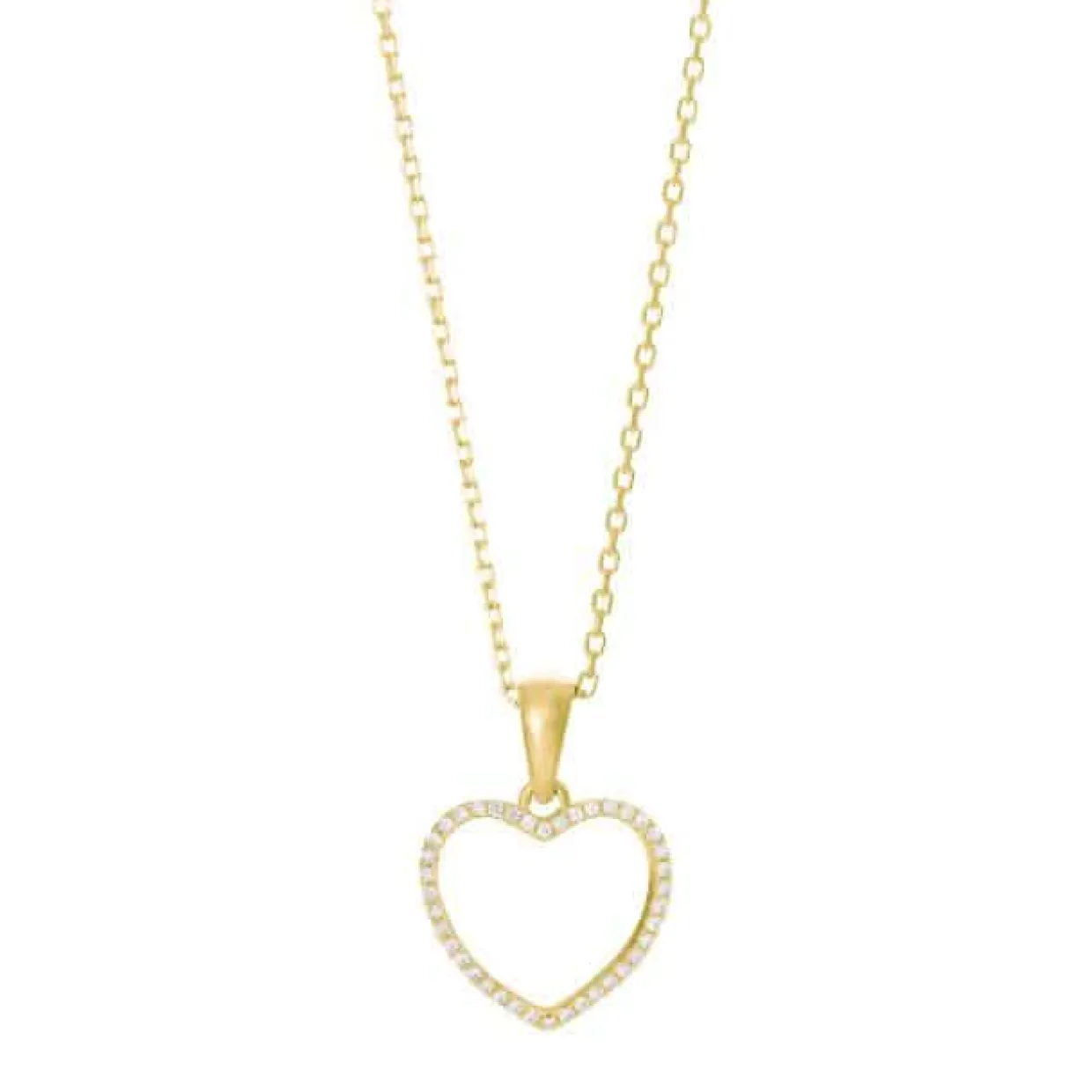 Denne finde halskæde er fremstillet i sterling sølv og belagt med 18 karat guld. Halskæden har et hjerte vedhæng besat med hvide zirkoner. Hjertet måler 15×16 mm og kæden måler 42-45 cm.