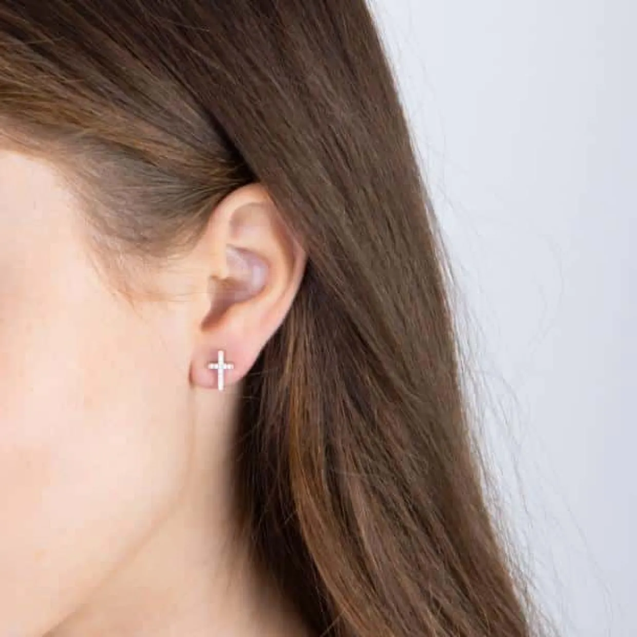 Søde ørestikker i rhodineret sterling sølv. Øreringene er designet som kors, og her belagt med kubiske zirkonia. Korset måler 6x10mm.