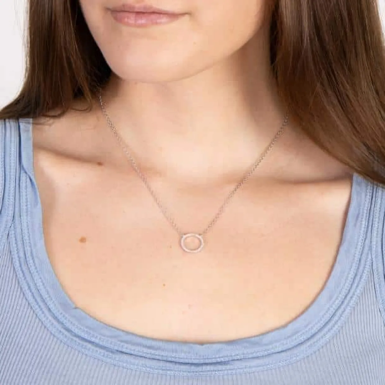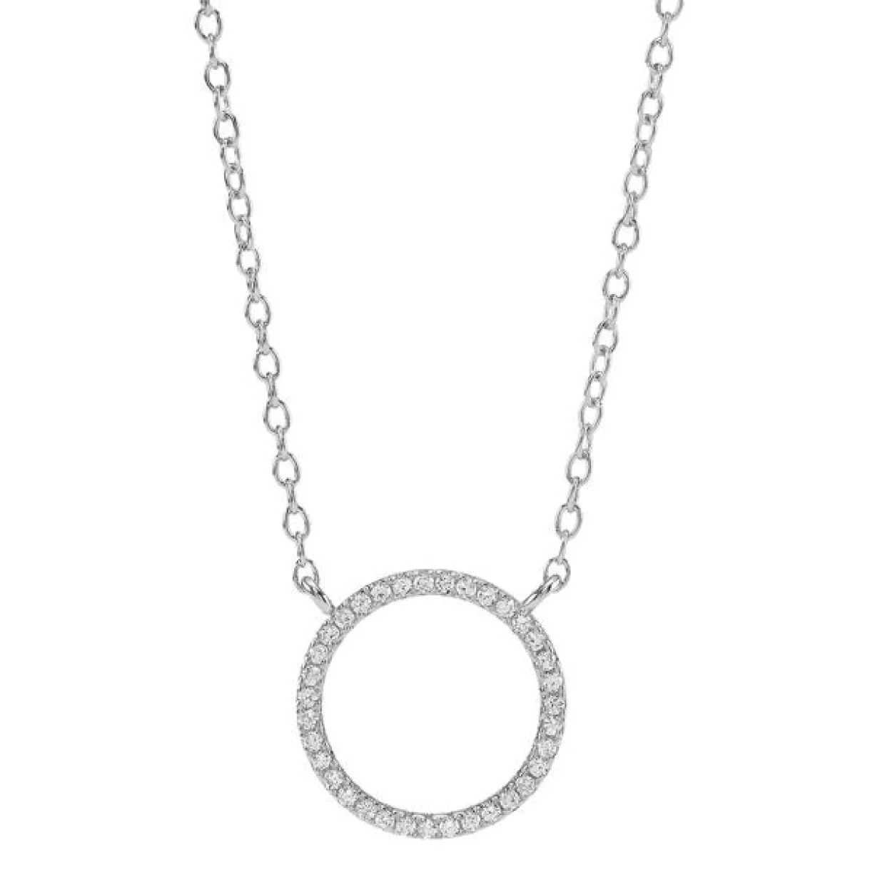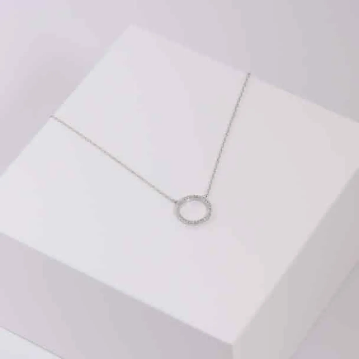 Sølv halskæde cirkel med syntetiske zirkonia. Cirklen måler 14 mm i diameter. kæden er en rund anker kæde på 42+3 cm.