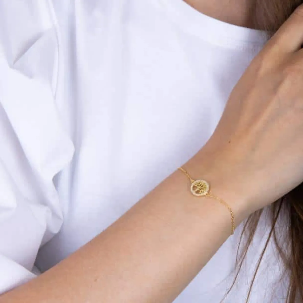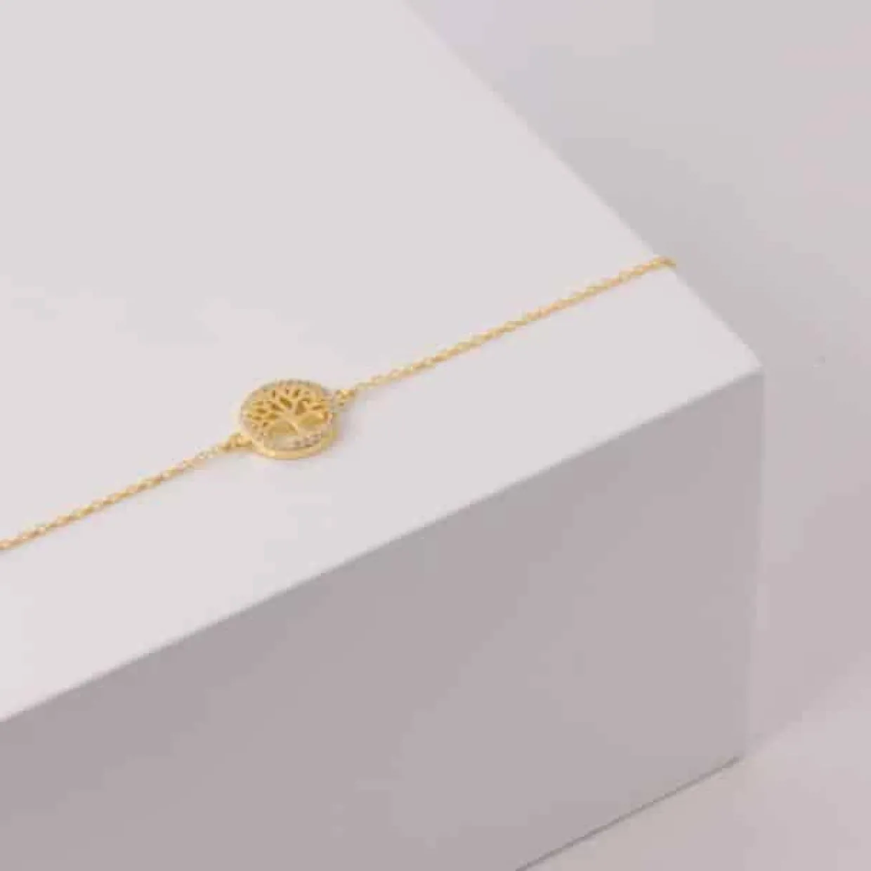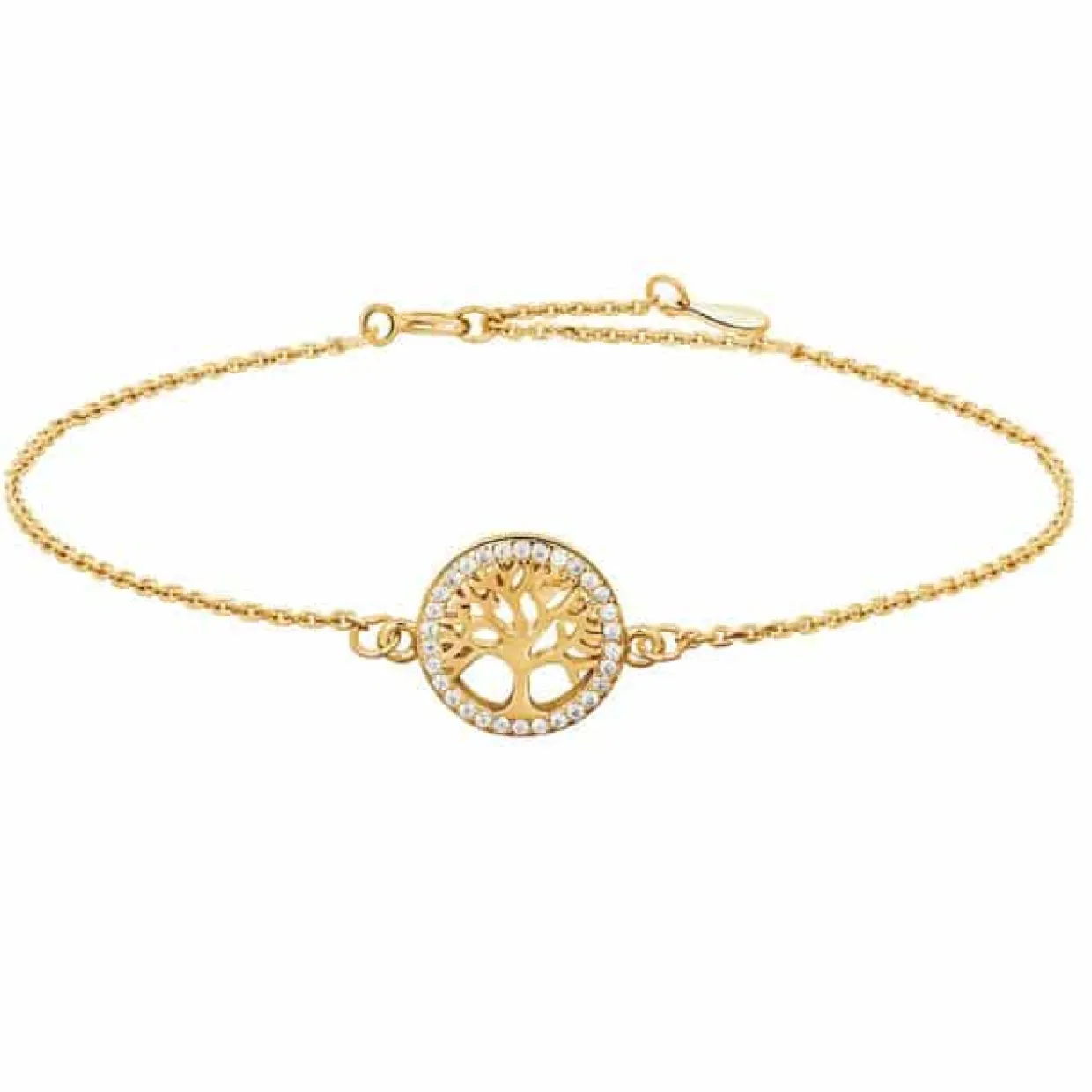 Sølv forgyldt armbånd med livets træ. Armbåndet er forgyldt med en 18 karat forgyldning og en længde på 17 cm som kan forlænges op til 20 cm. Selve vedhænget livets træ har en diameter på 11 mm med syntetiske zirkonia rundt i kantet.