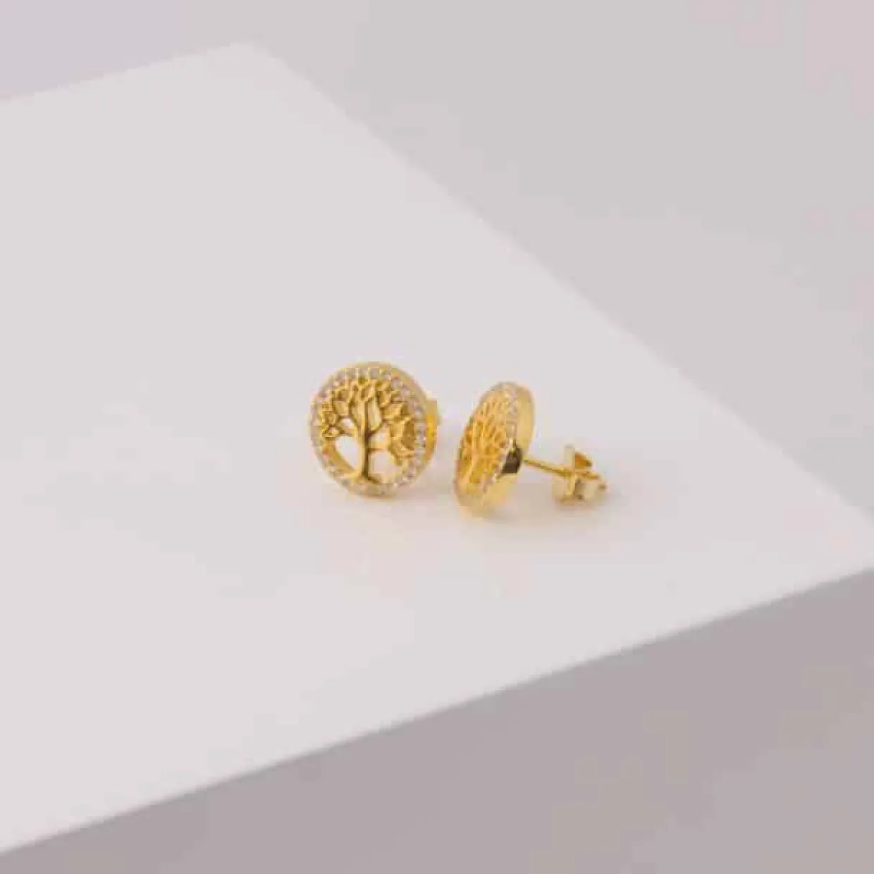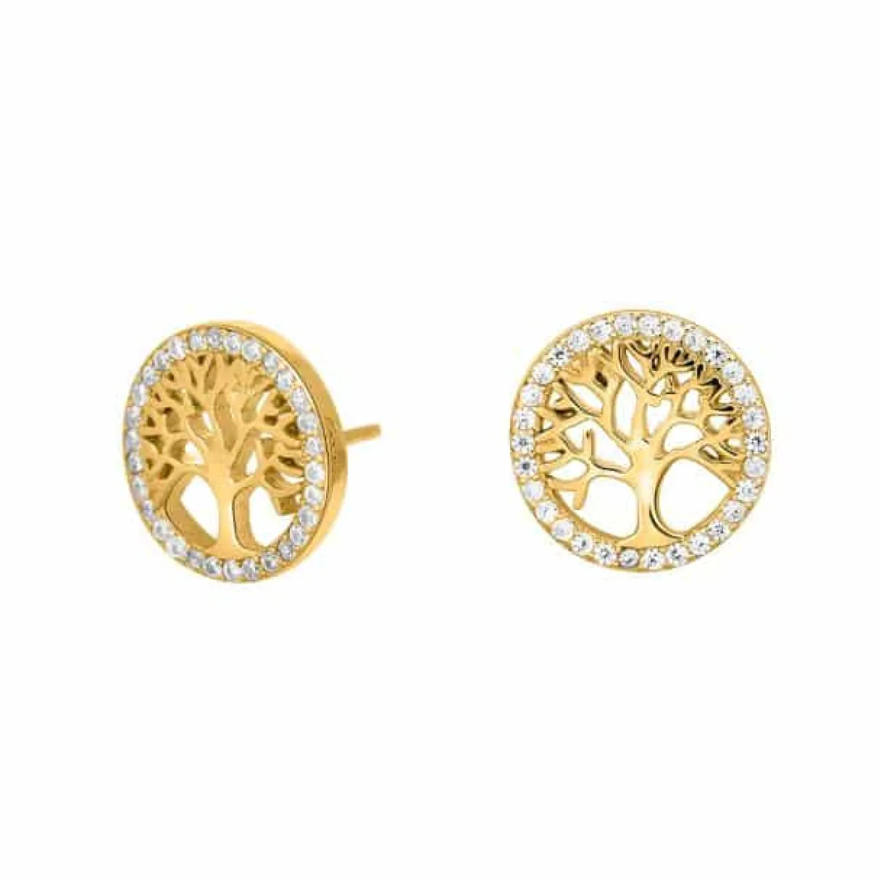 Sølv forgyldt øreringe på stik med livets træ. Øreringe 11 mm i diameter og der er syntetiske zirkonia rundt i kanten.