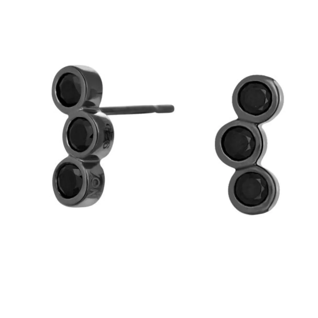 Denne enkle og moderne ørestik er fremstillet i sort rhodineret sterling sølv. I hver ørestik sidder der tre rørfattede kubisk zirkonia, sat i en svag bue. Måler 12×5 mm
