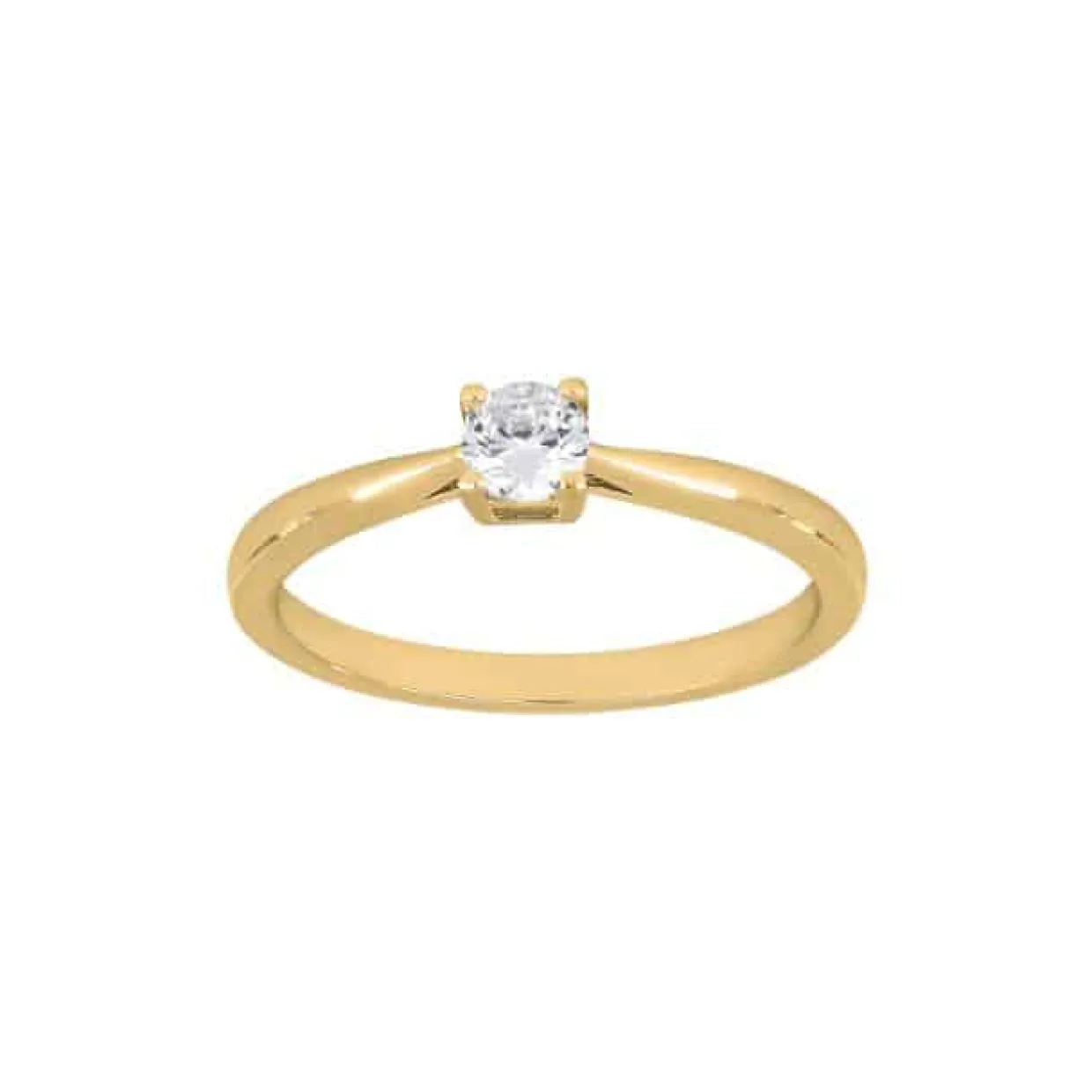 Denne enkle og elegante solitaire ring er laver i sterling sølv og forgyldt med 18 kt guld. Ringen har en hvid kubisk zirkonia, der fastholdes af 4 grabber.