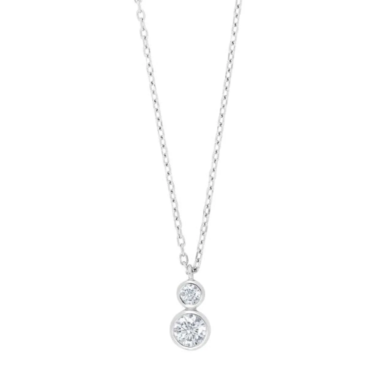 Sølv halskæde med to syntetiske zirkonia. Vedhænget måler 8,5 mm i højden og 5 mm i bredden. kæden er en rund anker kæde på 42+3 cm, som kan ombyttes efterfølgende.