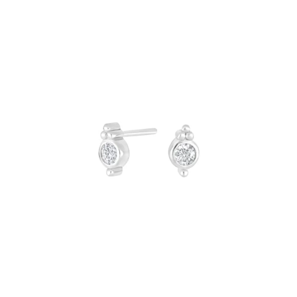 Sølv rhodineret øreringe på stik med syntetiske zirkonia. Øreringene måler 6,8 mm i højden og 3,9 mm i bredden. Rhodineringen gør at øreringene holder sig pænere i længere tid og giver lidt mere gråligt look.