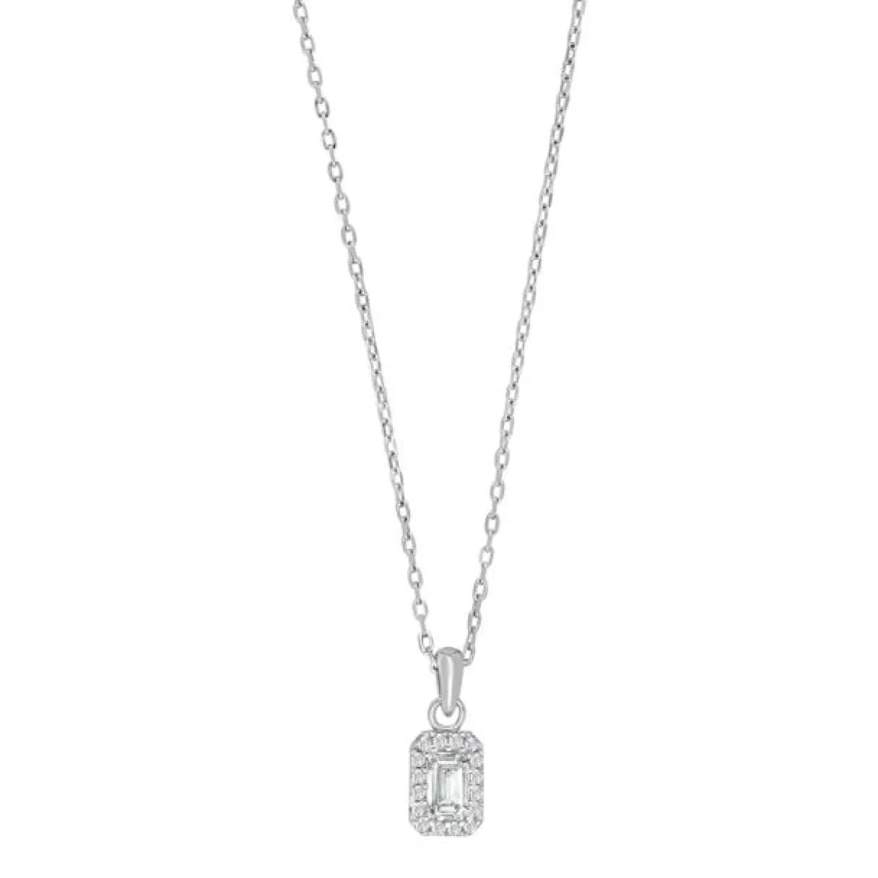 Sølv halskæde med syntetiske zirkonia. Vedhænget måler 7 mm højden og 5 mm i bredden. Kæden er en rund anker kæde på 42+3 cm, som kan ombyttes efterfølgende.