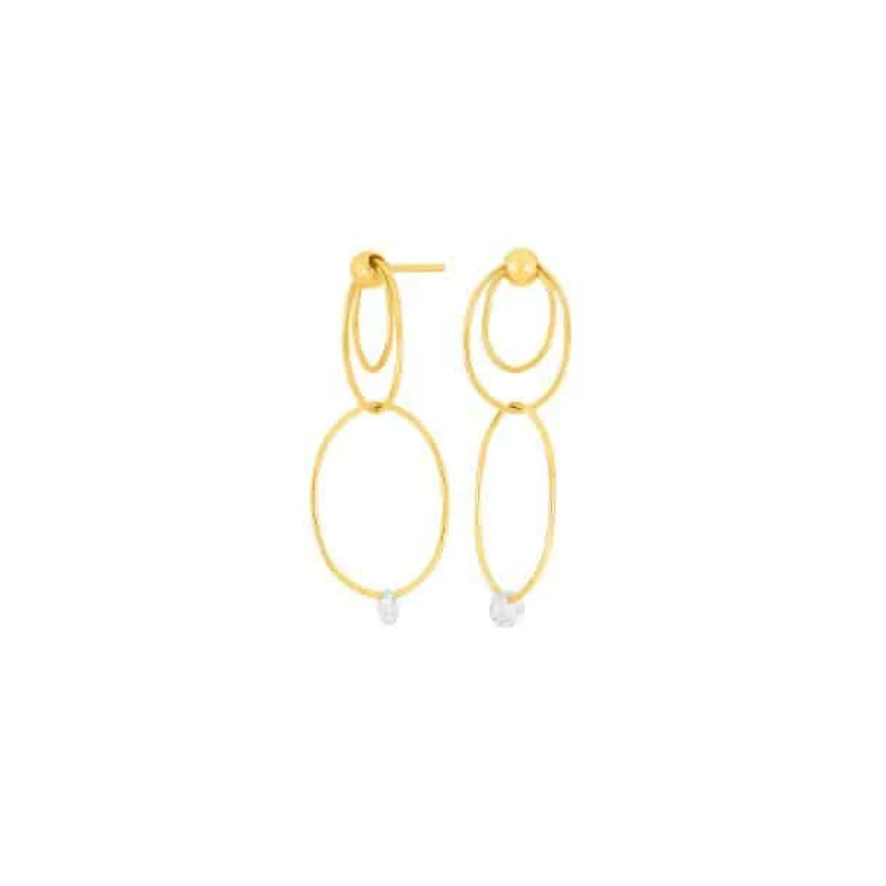 Øreringe lavet i 925 sterling sølv, som er forgyldt. Ørestikkerne måler 13 i bredden og 34 mm i længden, designet med tre cirkler forneden i er der en facetteret zirkonia i hver ørering.