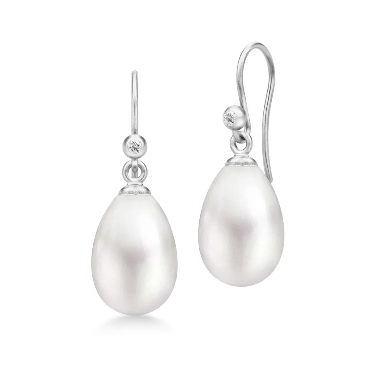 Perle ørehængerne er satinrhodineret 925 sterlingsølv med en oval hvide ferskvandsperler og facetslebne, klare zirkoner.