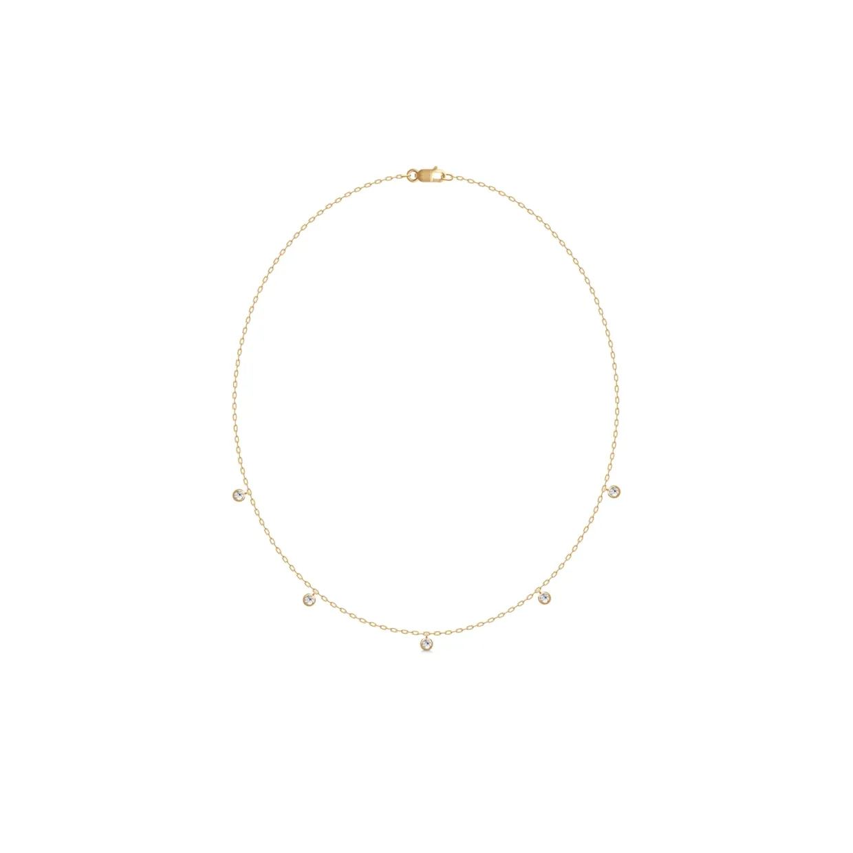 Rundt på halskæden sidder fem zirkonia i runde fatninger.