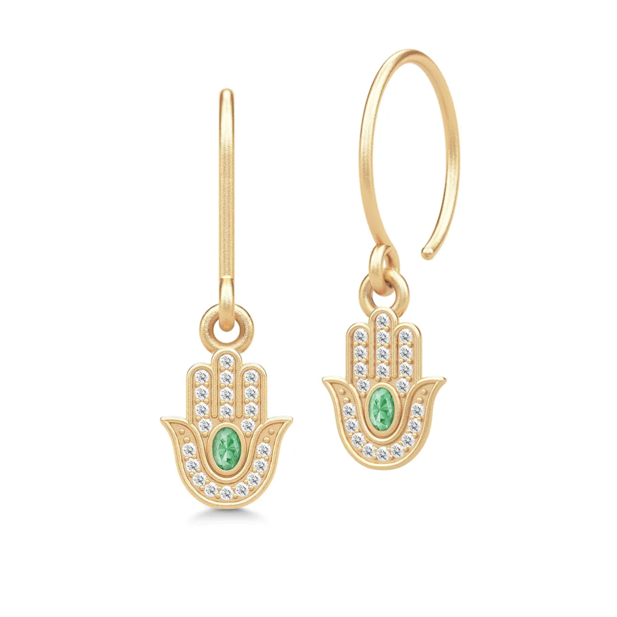 Hamsa-symbolet er kendt som et tegn på beskyttelse, styrke og held, hvilket gør disse øreringe til mere end blot et smykke – de bærer en betydning og fortæller en historie. Det detaljerede design kombineret med den varme forgyldning skaber et feminint og sofistikeret look, som passer perfekt til både hverdag og festlige lejligheder.
