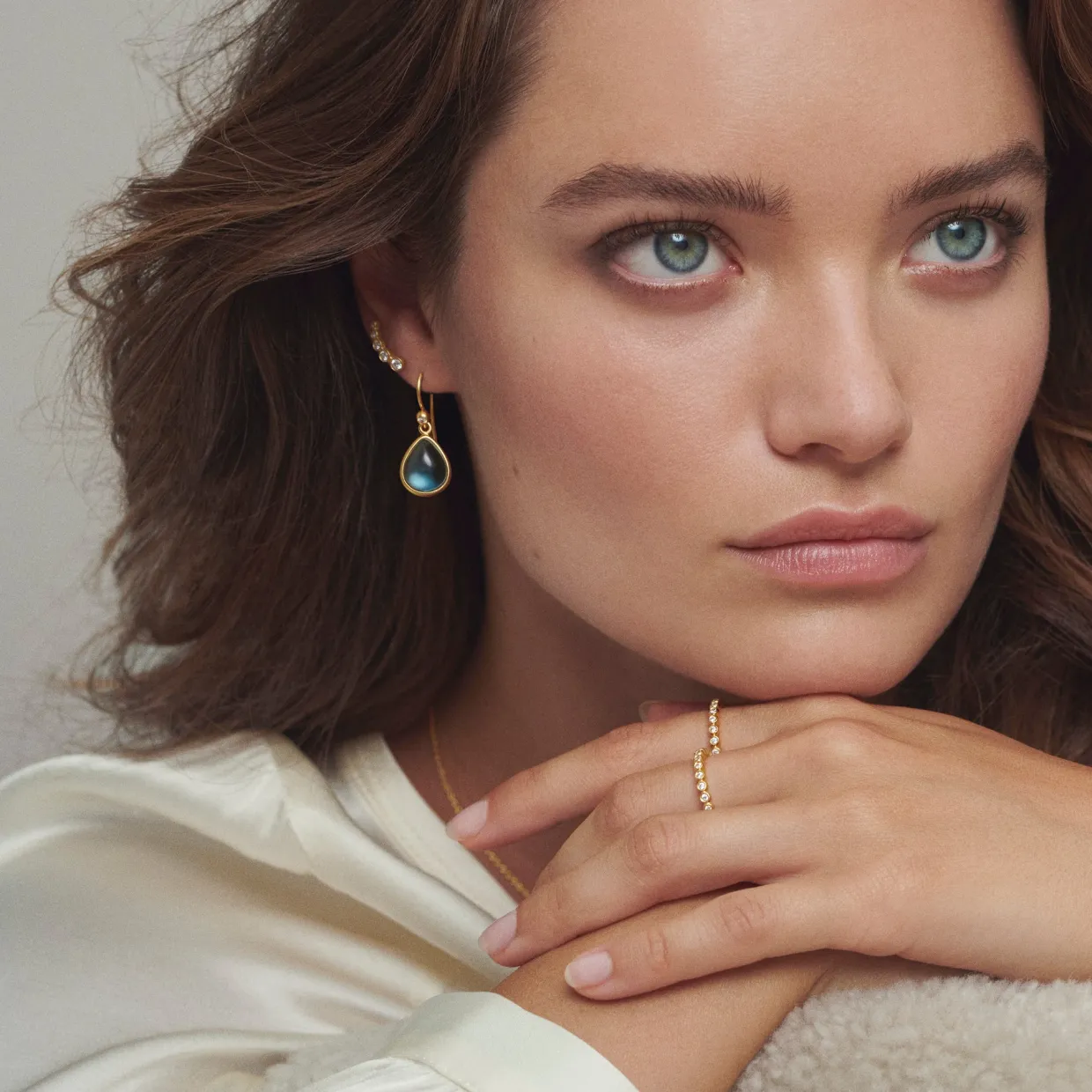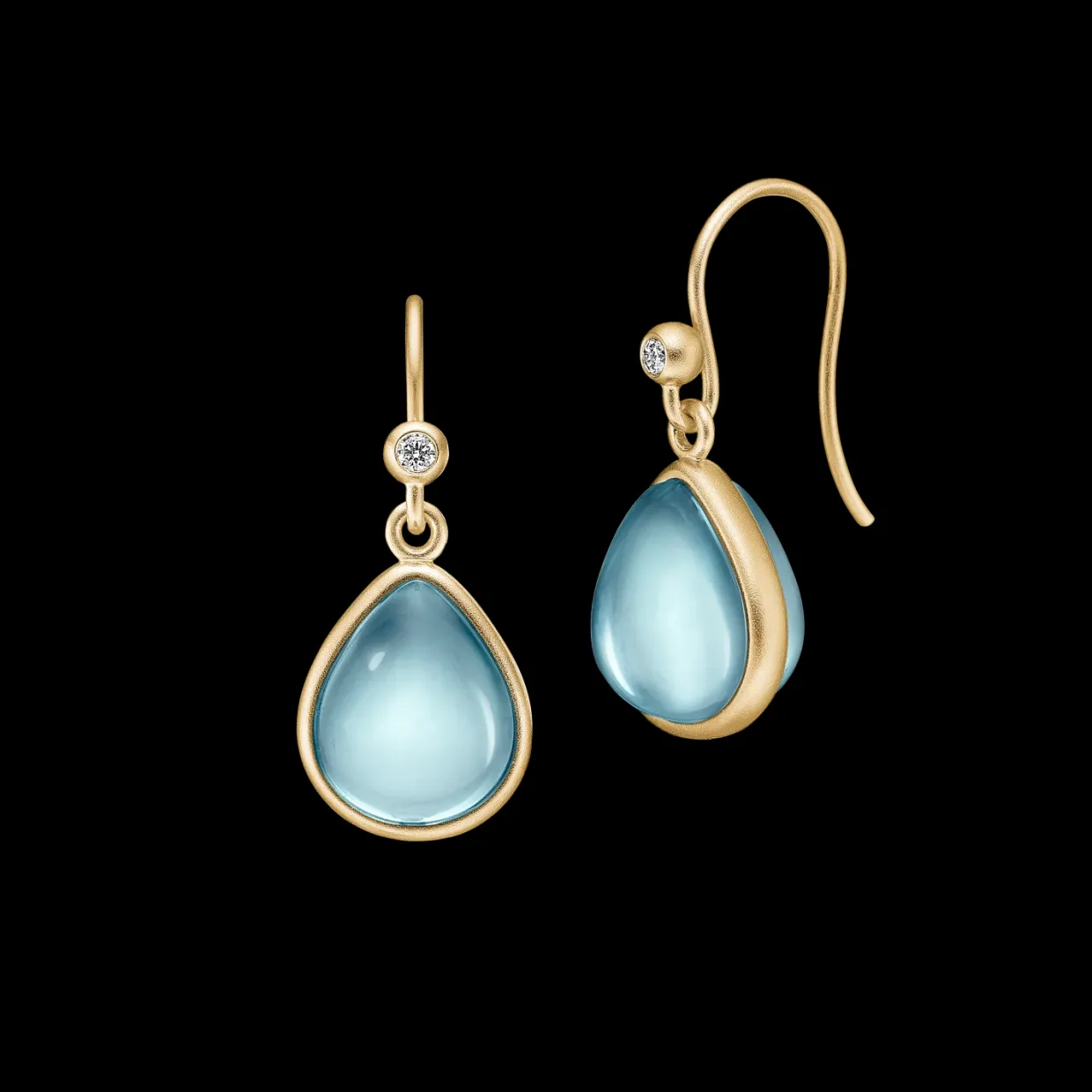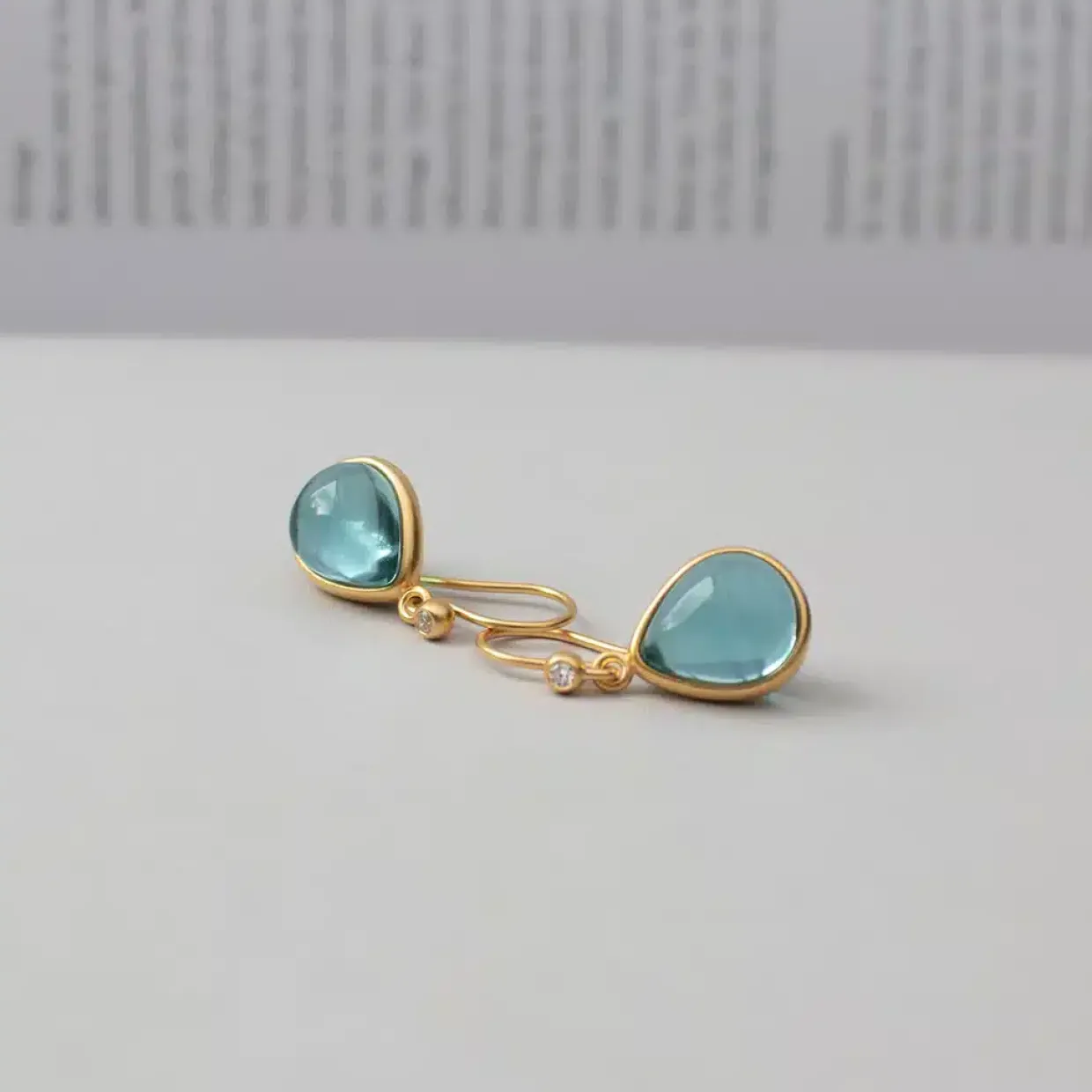Disse øreringe er en del af kollektionen Paloma og har en tidløs charme. De er udstyret med smukke isblå pear cabochon krystaller, der er indsat i en elegant, afrundet indfatning. Fremstillet i 22 karat forgyldt sterling sølv, med en kubisk zirkonia detalje på krogen, og har målene 26 x 10,7 mm. En sublimt smuk tilføjelse til enhver samling.