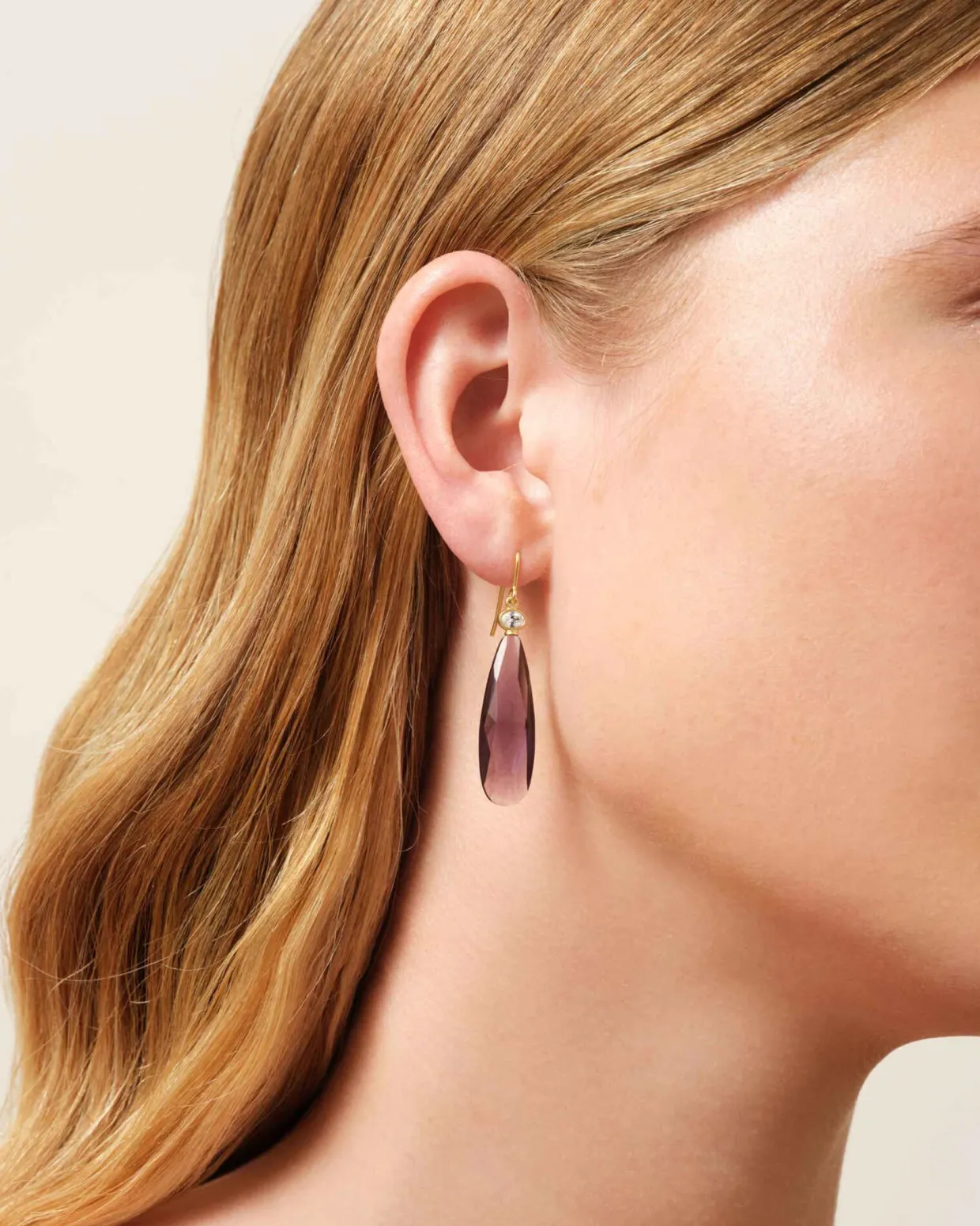 Midtpunktet er en dråbeformet ametystfarvet krystal, der med sin dybe lilla nuance skaber et smukt samspil med guldbelægningen. Rundt om stenen er der klare kubiske zirkonia, som tilfører ekstra glans og et sofistikeret udtryk.