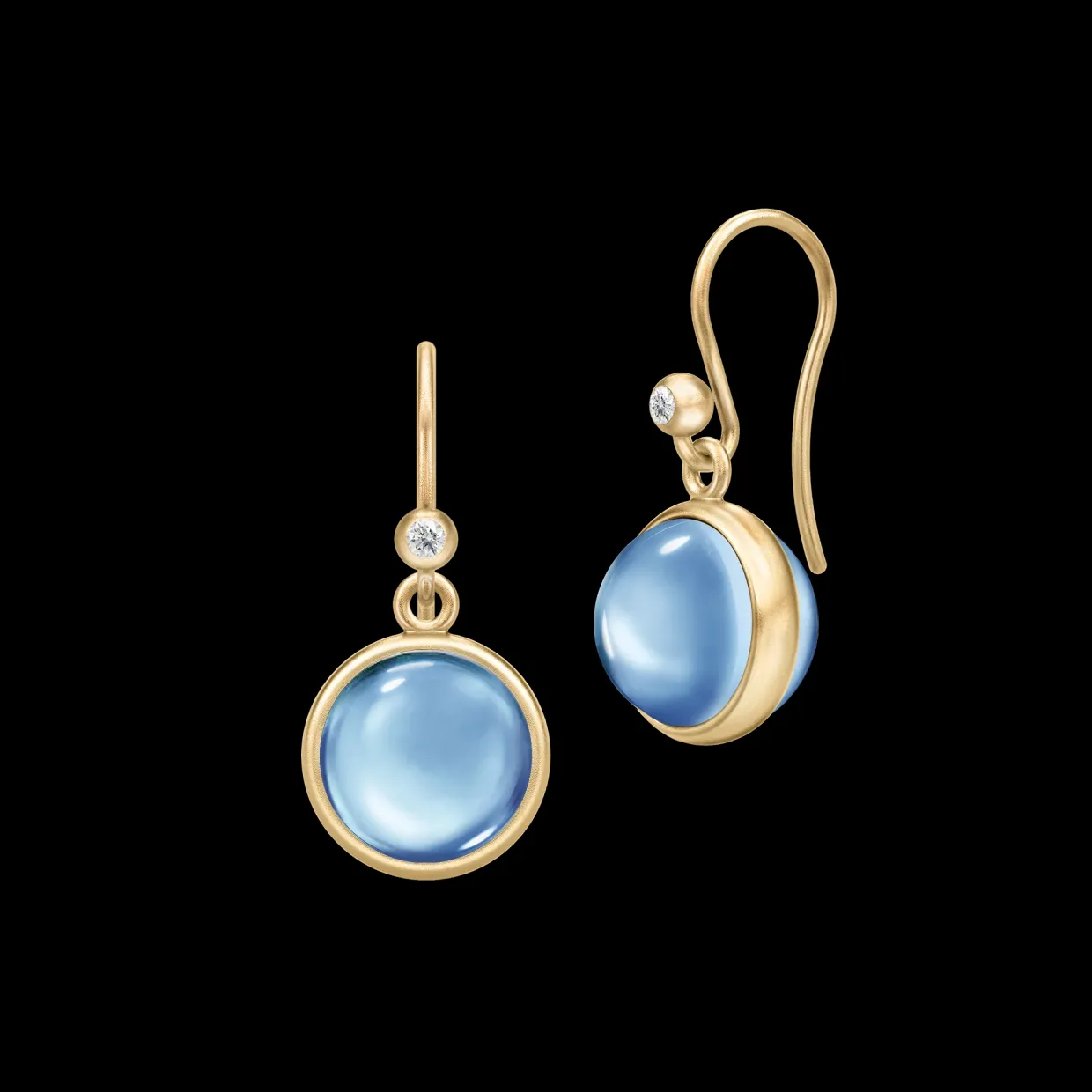 Julie Sandlaus kendte kollektion, Prime kommer her i en flot klar blå farve. Øreringe er håndlavet i 22 karat forgyldt 925 sterlingsølv, med is blå krystaller og kubiske zirkoner. Krystallerne, der hænger flot lige under øreflippen er runde cabochoner der måler 10 mm.