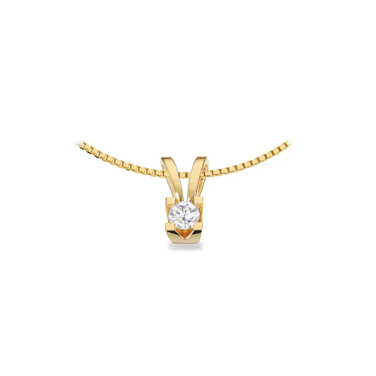 14 karat guld vedhæng med brillant på 0,20 carat i kvaliteten wesselton/si. Vedhænget er med blank oveflade og uden kæde. Til vedhænget er der tilknyttet en ombytningsret, at man inden for to år kan ombytte vedhænget til minimum nummeret større ved at betale differencen.