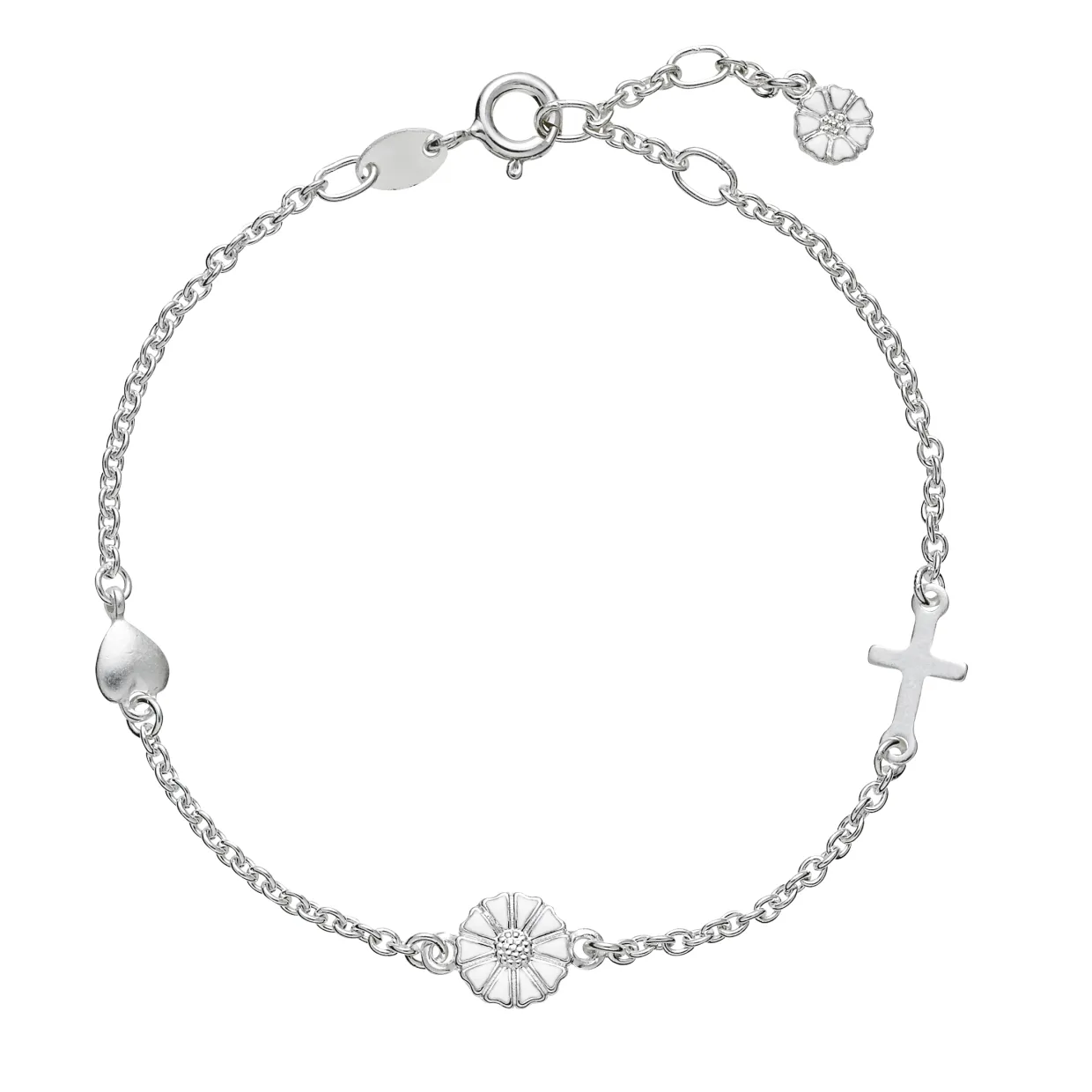 Dette klassiske armbånd med tro, håb og kærlighed er lavet i sterling sølv og har en marguerit på 7,5 mm og en på 5 mm. Regulerbar til længde 17,18 og 19 mm.