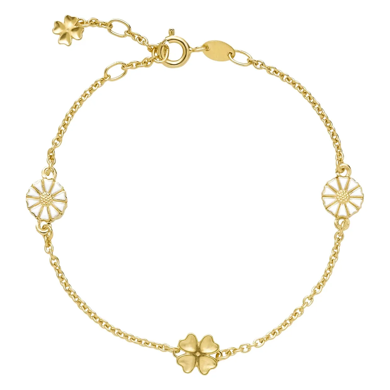 Smuk nyhed forgyldt sølv armbånd med margueritter og firkløver fordelt på kæden.