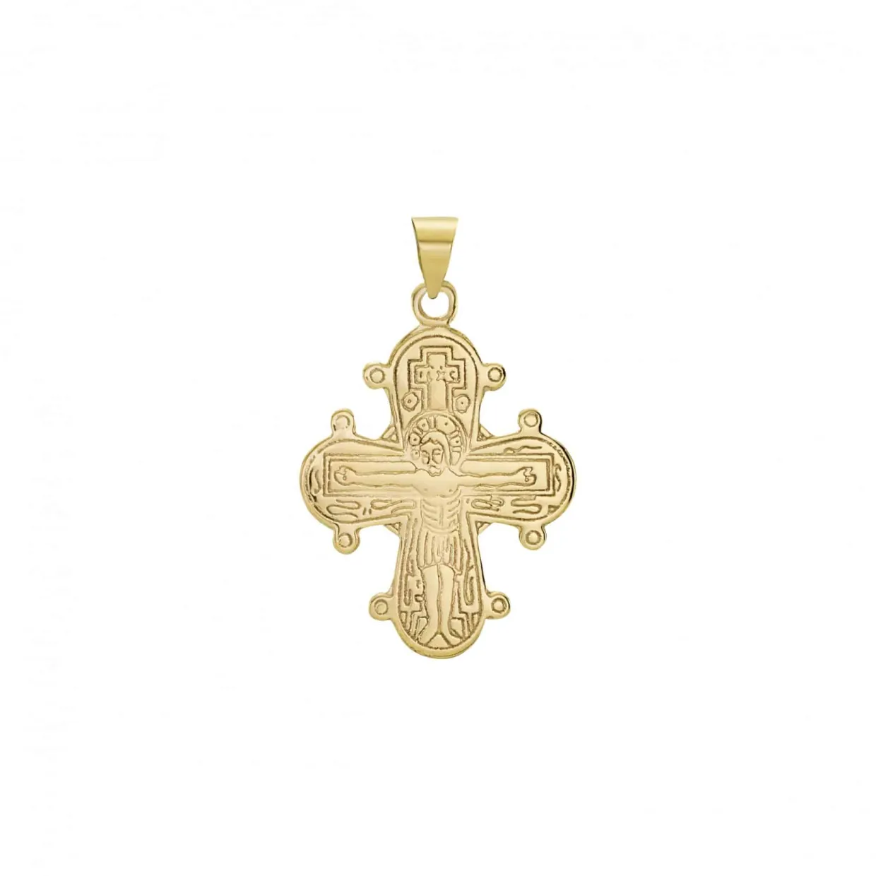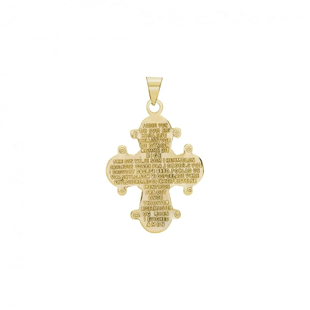Korset er skabt i 8kt guld på forsiden hænger Jesus og på bagsiden er der indgraveret fadervor.