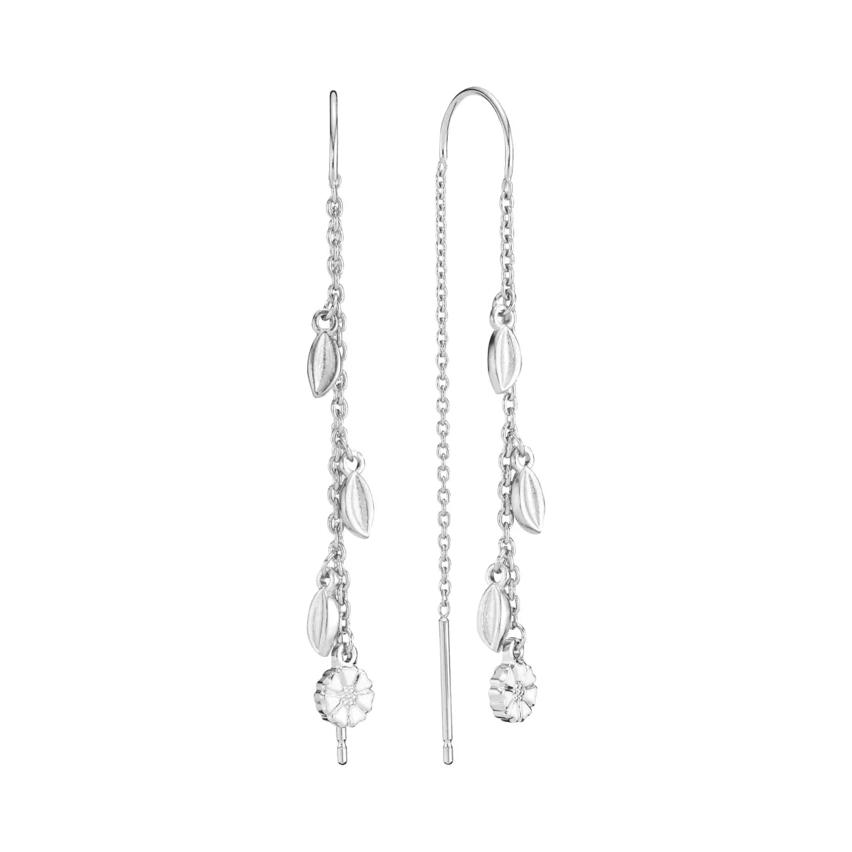 Sølv øreringe som hænger med blade og marguerit. Margueritten måler 5 mm og er med hvid emalje. Ørehængerne trækker man igennem øret, men er med fast bøjle, så den sidder pænt i øret.
