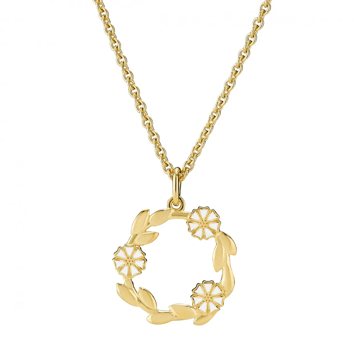 Flot sølv forgyldt halskæde med en krans af margueritter, til denne serie findes der tilhørende ring og ørehængere