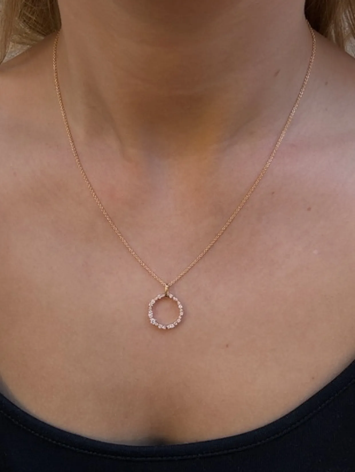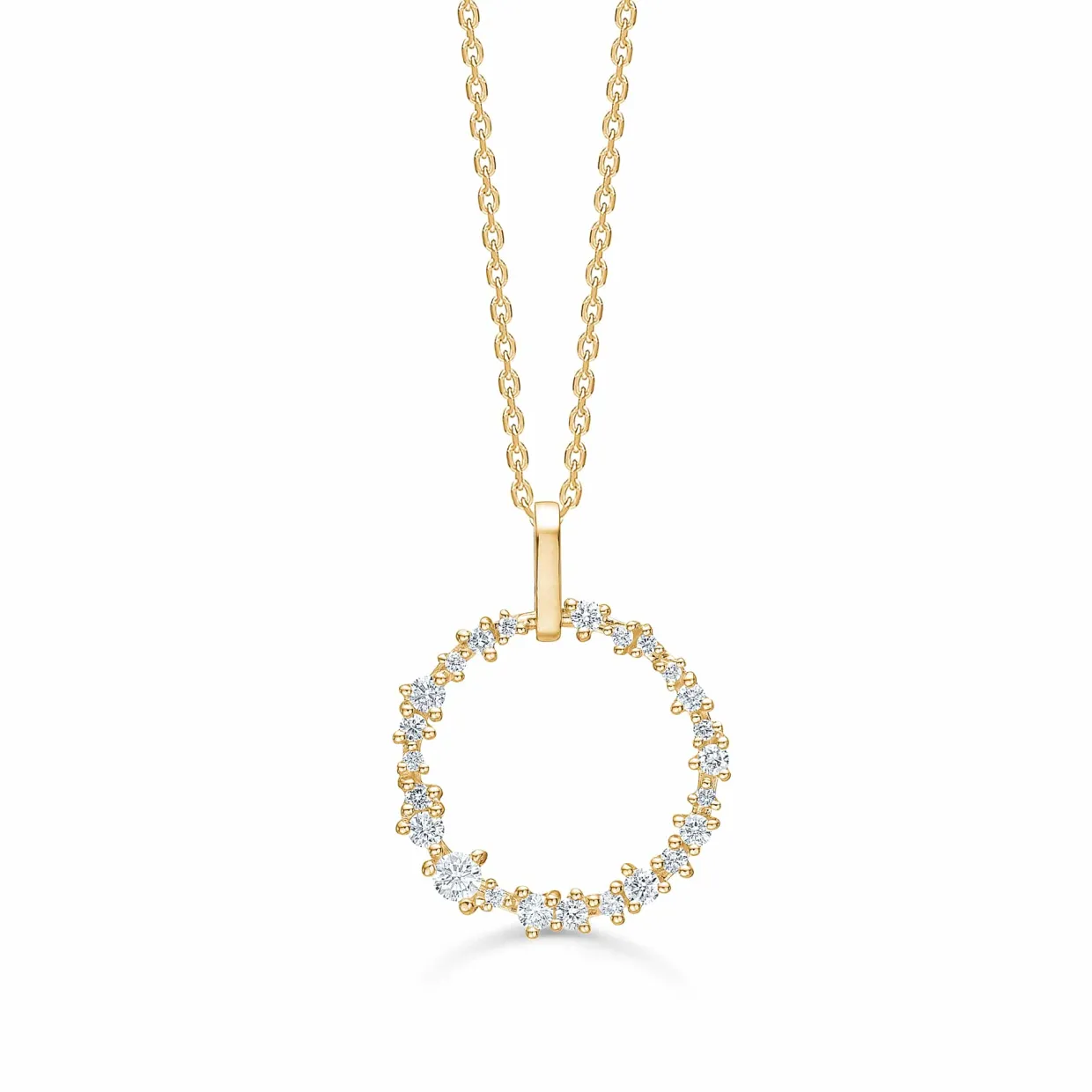Vedhænget har en diameter på 20 mm, hvor diamanterne rundt i kransen har en samlet carat på 0,30 i kvaliteten wesselton/si.