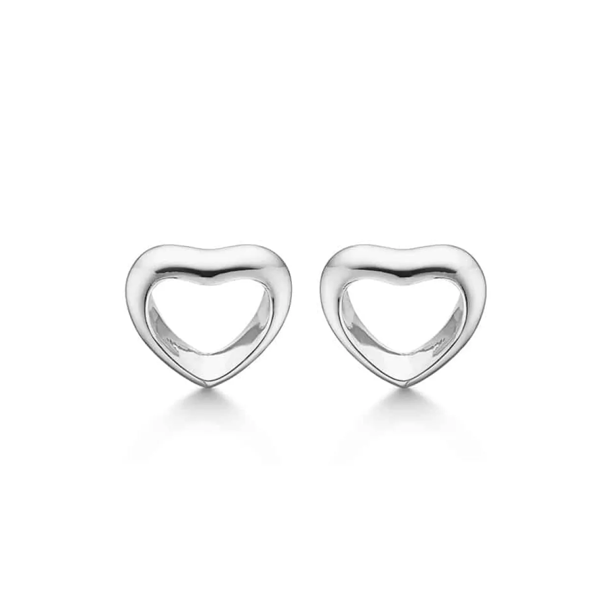 Sølv øreringe med hjerte. Øreringene er laver massiv sterling sølv og sidder på stik. Hjerterne er enkelte men med åbningen i midten giver de et flot spil på øret.