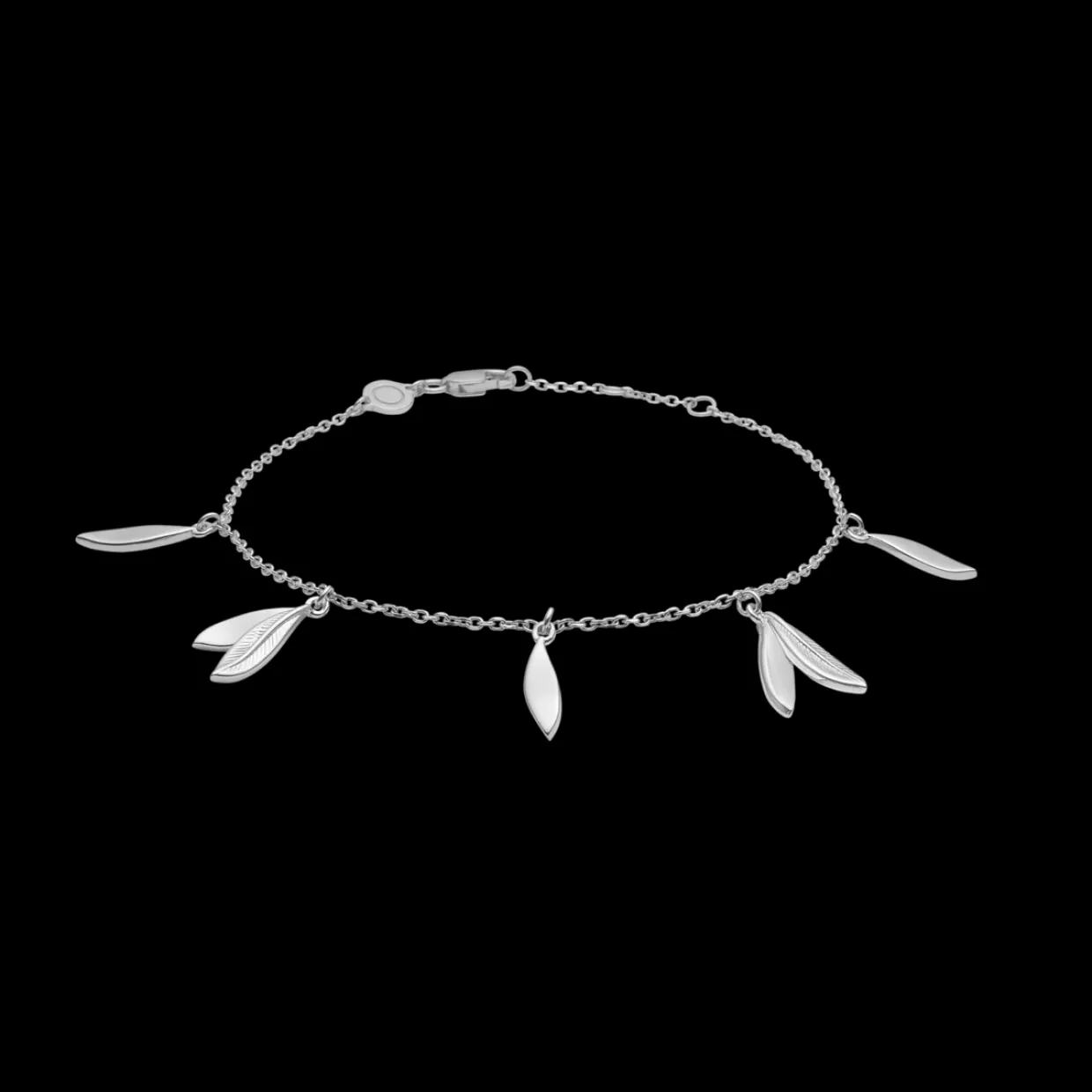 Smuk sølv armbånd med små fjer som giver liv på armen når de små led ligger sig på håndledet