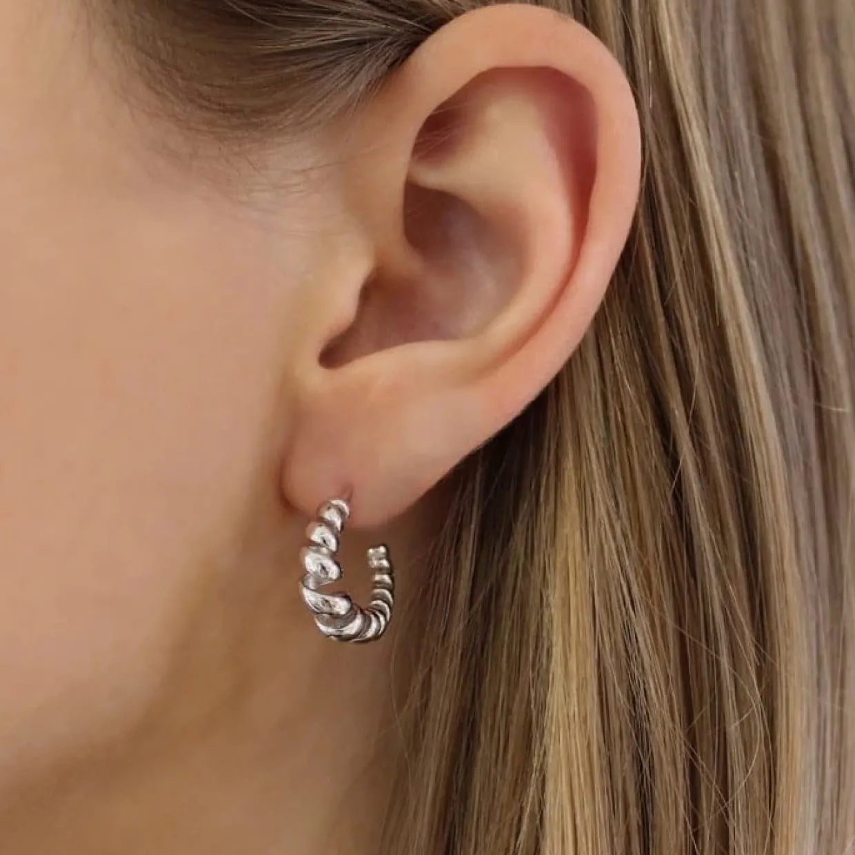 Sølv øreringe som creol snoet. Øreringene er fra serien SWIRL hvor der også findes en ring til. Øreringene i snoet mønster og med blank overflade. Creolerne er på stik.