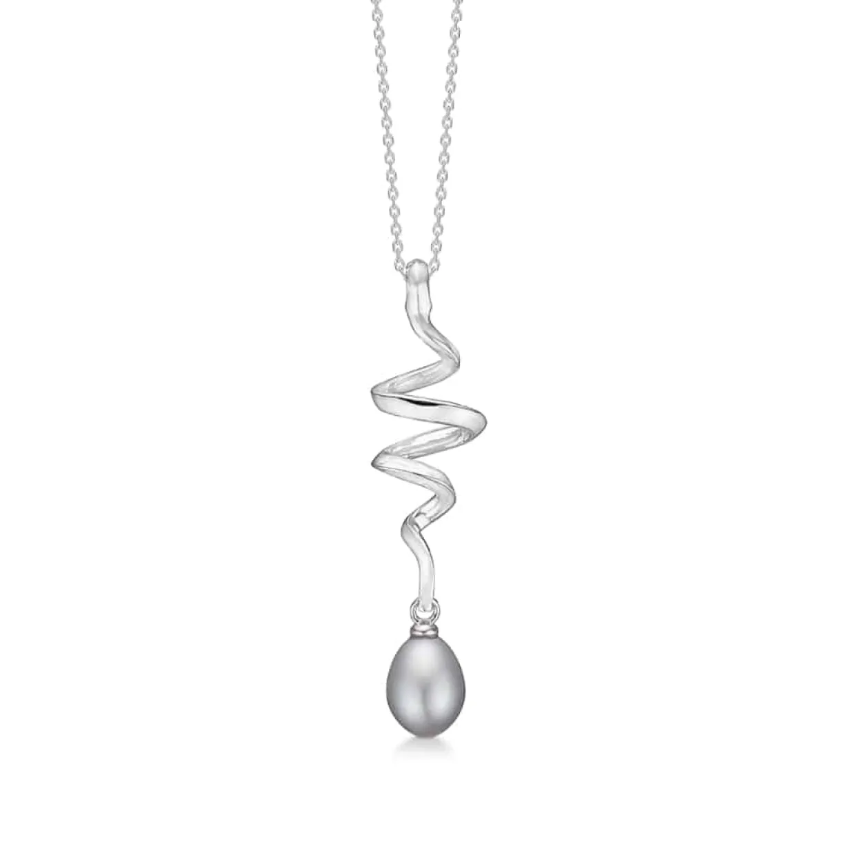 Sølv halskæde med vedhæng som snoet og perle i enden. Kæden kan varieres fra 40-45 cm, så den passer perfekt til netop din hals. Vedhæng måler 45 mm og perlen er en kultur perle.