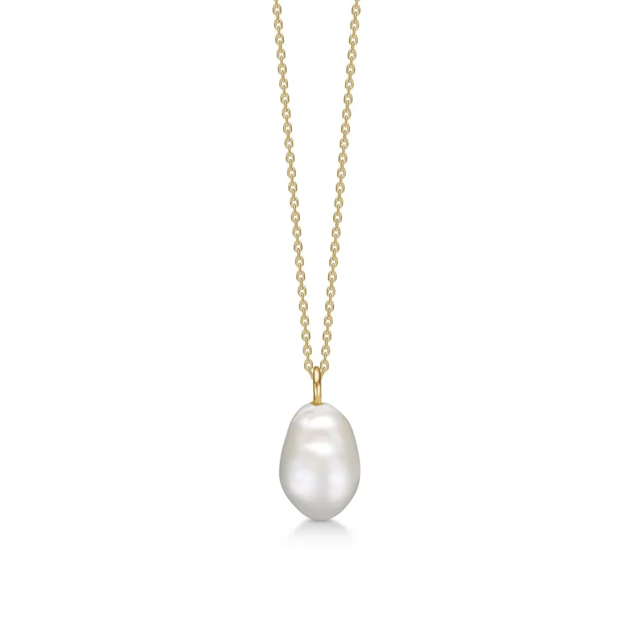 14 karat guld vedhæng med perle. vedhænget er fra serien TREASURE. Til vedhænget følger en sølv forgyldt rund anker kæde i tråd 0,40 mm og med en længde på 45 cm.