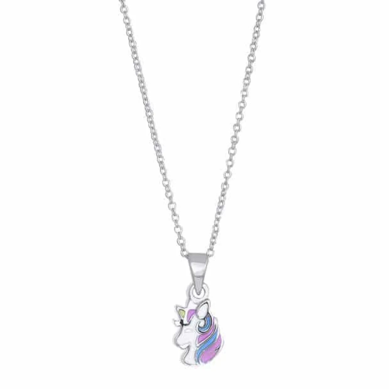 Sølv halskæde med enhjørning med emalje. Vedhænget måler 9,3 mm i højden og 6,65 mm i bredden. Kæden er 38 cm og kan ombyttes efterfølgende.