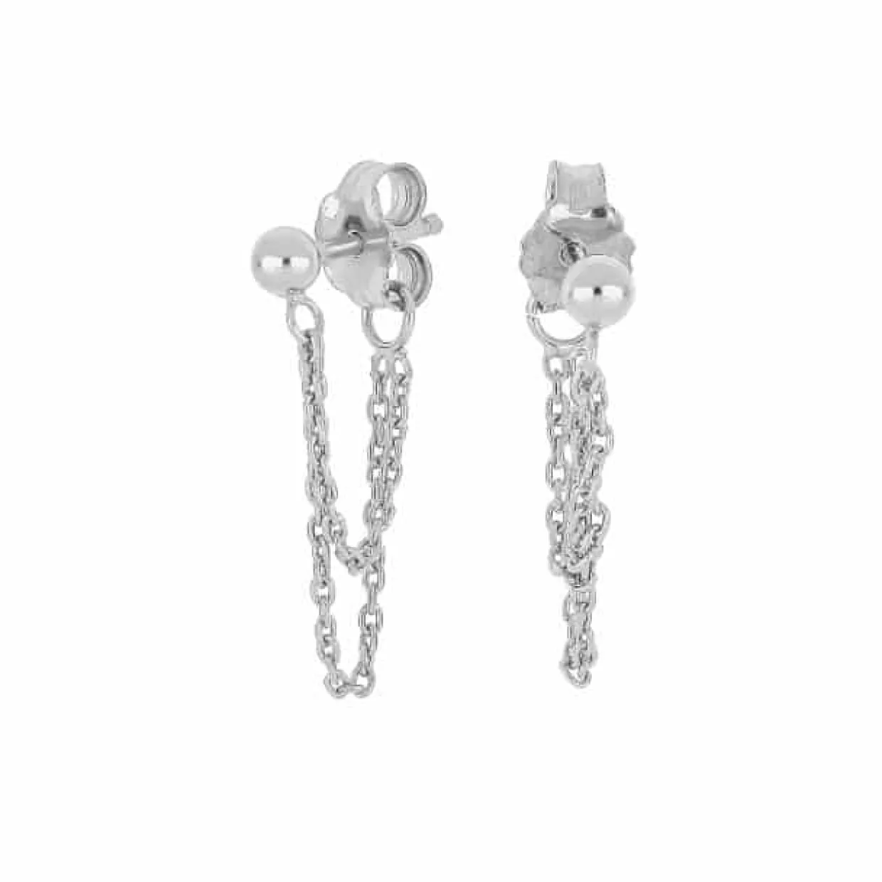 Øreringe i 925 sterling sølv, designet med en kugle hvor 2 stk. kæde i forskellige længder hænger ned fra, og slutter om til låsen. Den længste kæde måler 4 cm.