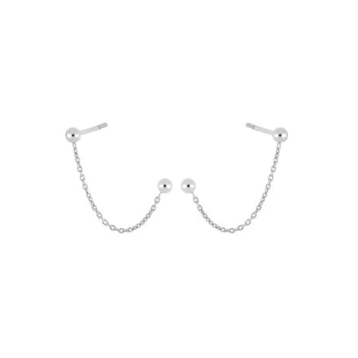 Disse klassiske øreringe med et lille twist, er fremstillet i sterling sølv. Øreringene er designet som ørestikkere, og hver ørering har to ørestikkere som sidder sammen med en sølv kæde, og skal sidde i samme øre når du har flere huller.