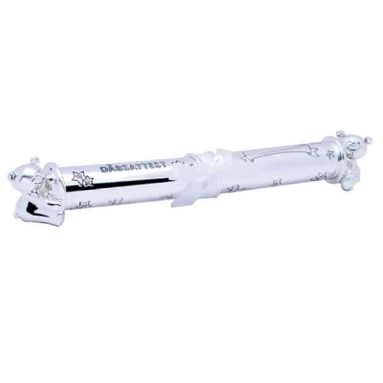 Forkromet dåbsrør med bamser i enderne. Dåbsrøret er til at man kan opbevarer sin dåbsattest i. Røret måler 29 cm i længden og 3 cm i bredden.
