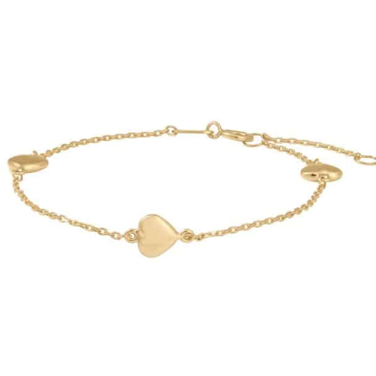 Sødt hjerte armbånd lavet i 8 karats guld, armbåndet er designet med tre hjerter som måler 4,7mm i bredden og 5,7mm i højden.