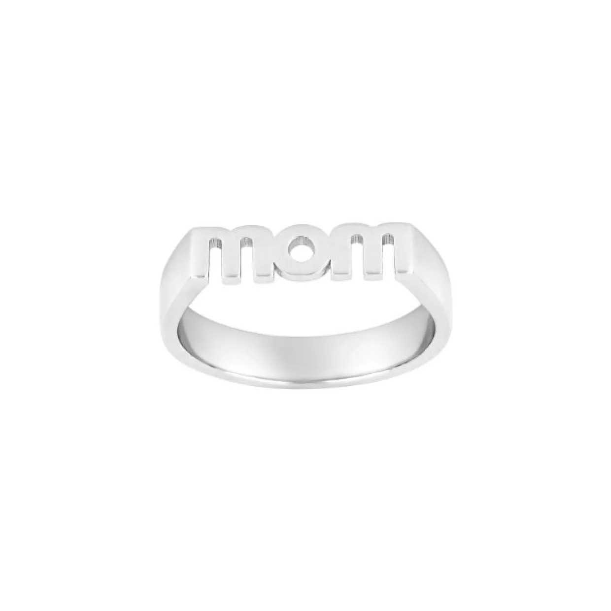 Sølv statement ring med skriften mom. Skriften på ringen er 4 mm høj, blank og uden sten. Ringen har fået en rhodium overflade behandling, så den holder sig pænere i længere tid.