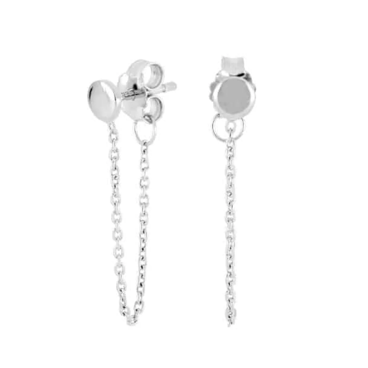 Smarte øreringe i rhodineret 925 sterling sølv. Øreringene er designet som ørestikker med en sølv plade, og en 4 mm lang kæde som går fra pladen til låsen bag på øret.