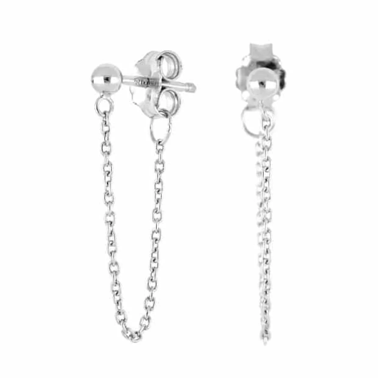 Smarte øreringe i rhodineret sterling sølv. Øreringene er designet som ørestikker med en sølv kugle, og en 4 mm lang kæde som går fra kuglen til låsen bag på øret.