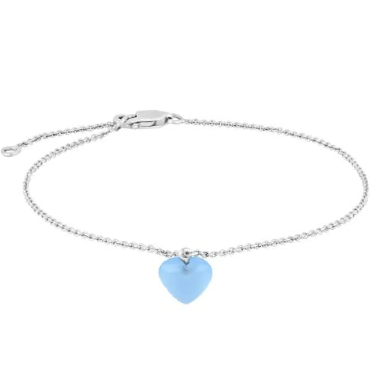 Dette fine armbånd er fremstillet i sterling sølv som er rhodineret. Armbåndet har en lille hjerte vedhæng på, som er lavet af blå kalcedon sten, som siges at bringe lykke. Armbåndet måler 17+3 cm med justerings stykke, og hjertet måler 8×8 mm.