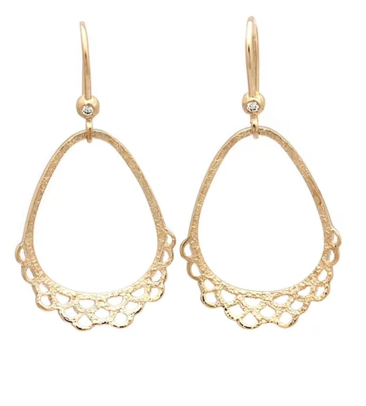 14 karat guld øreringe som hænger med brillant. Brillanterne er i alt 0,04 carat i kvaliteten top wesselton/vs. Øreringene er med rustik overflade.