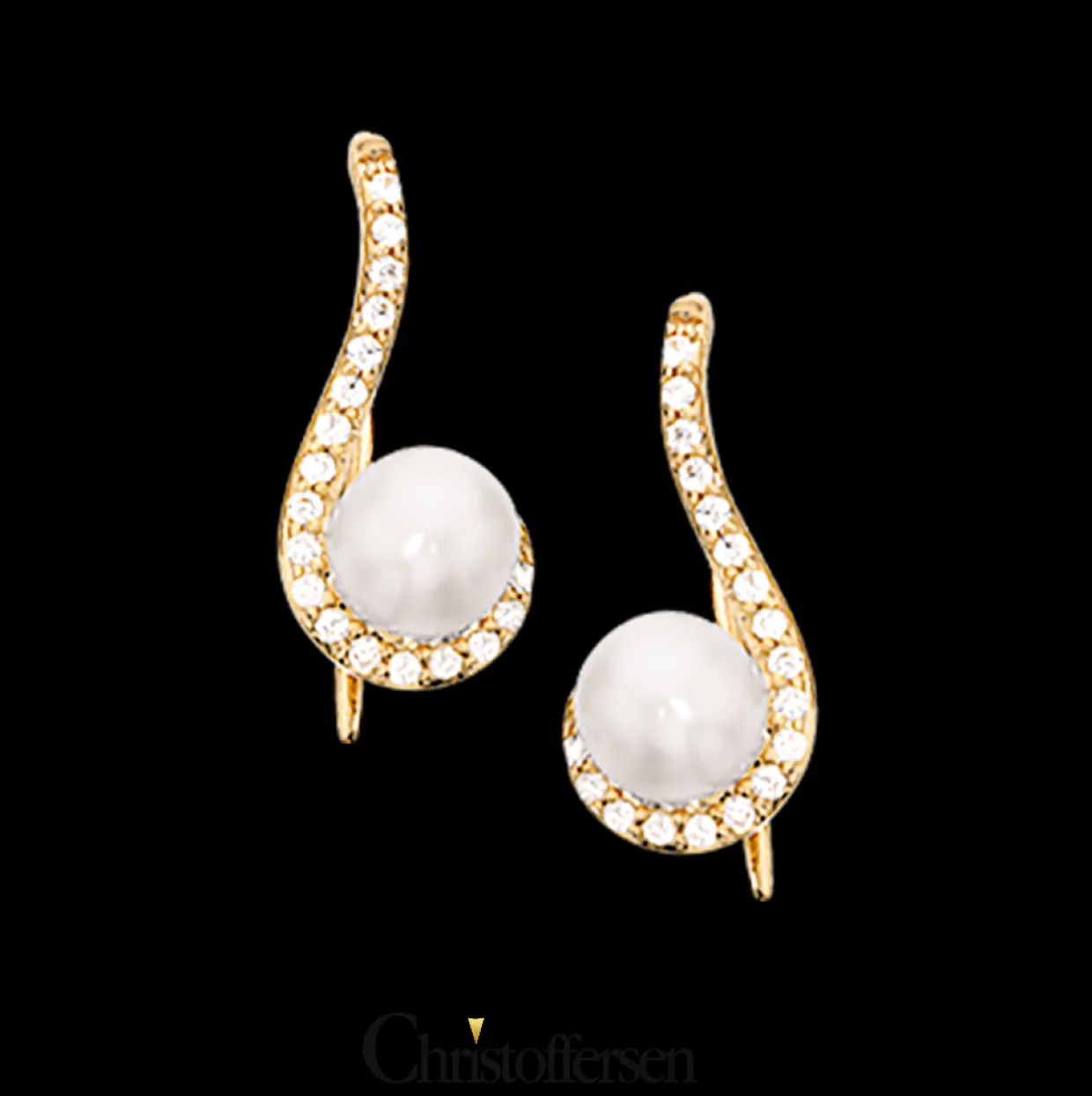 8 karat guld øreringe som hænger med stik. Øreringene er med en ægte ferskvandsperle og en masse af syntetiske zirkonia. Utrolig flotte ørehængere som skal ses.