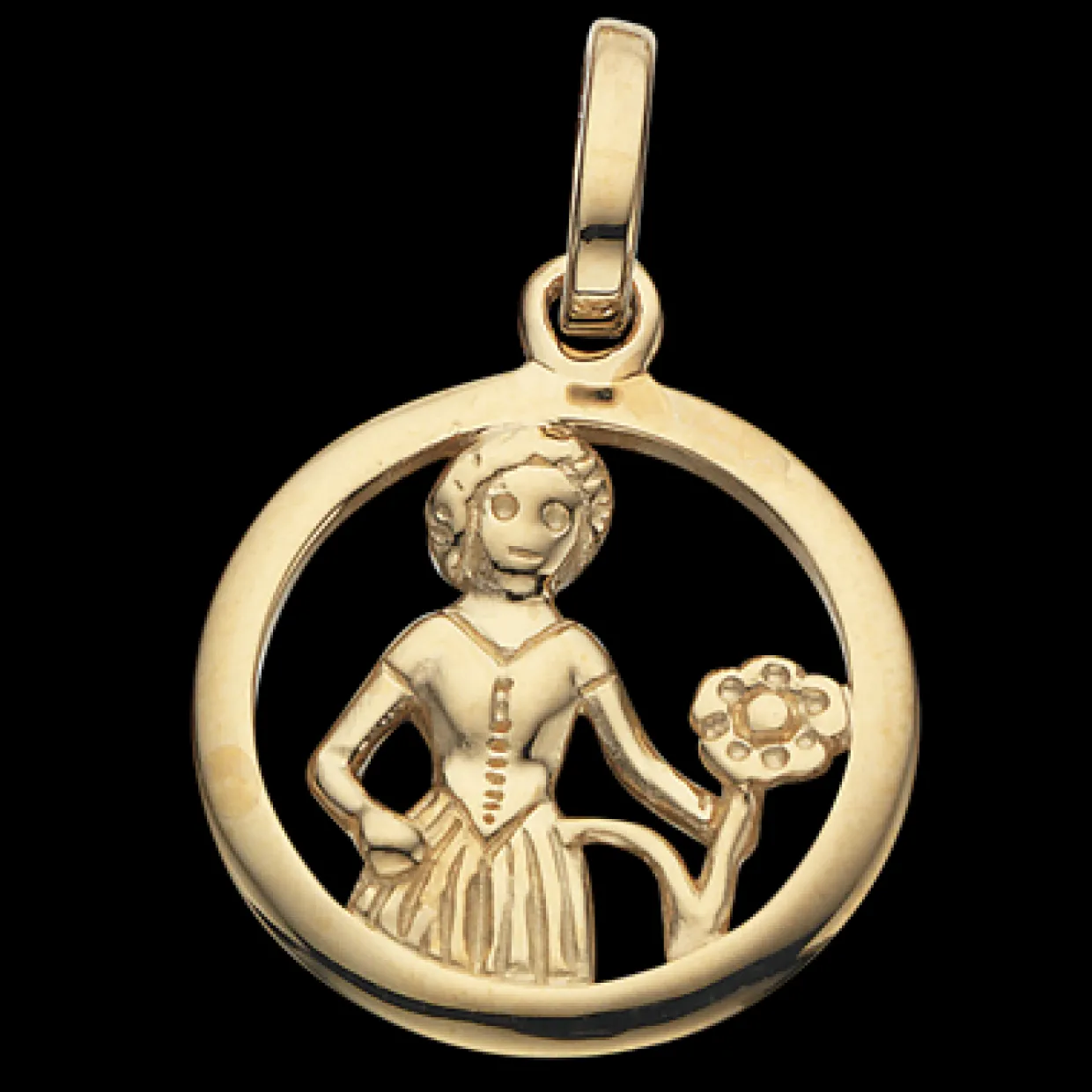 8 karat guld vedhæng med stjernetegnet jomfruen. Vedhænget er i massiv 8 karat guld, men vedhænget er uden kæde. Vedhænget måler 12 mm i diameter og er en pæn størrelse uden og være for stor.