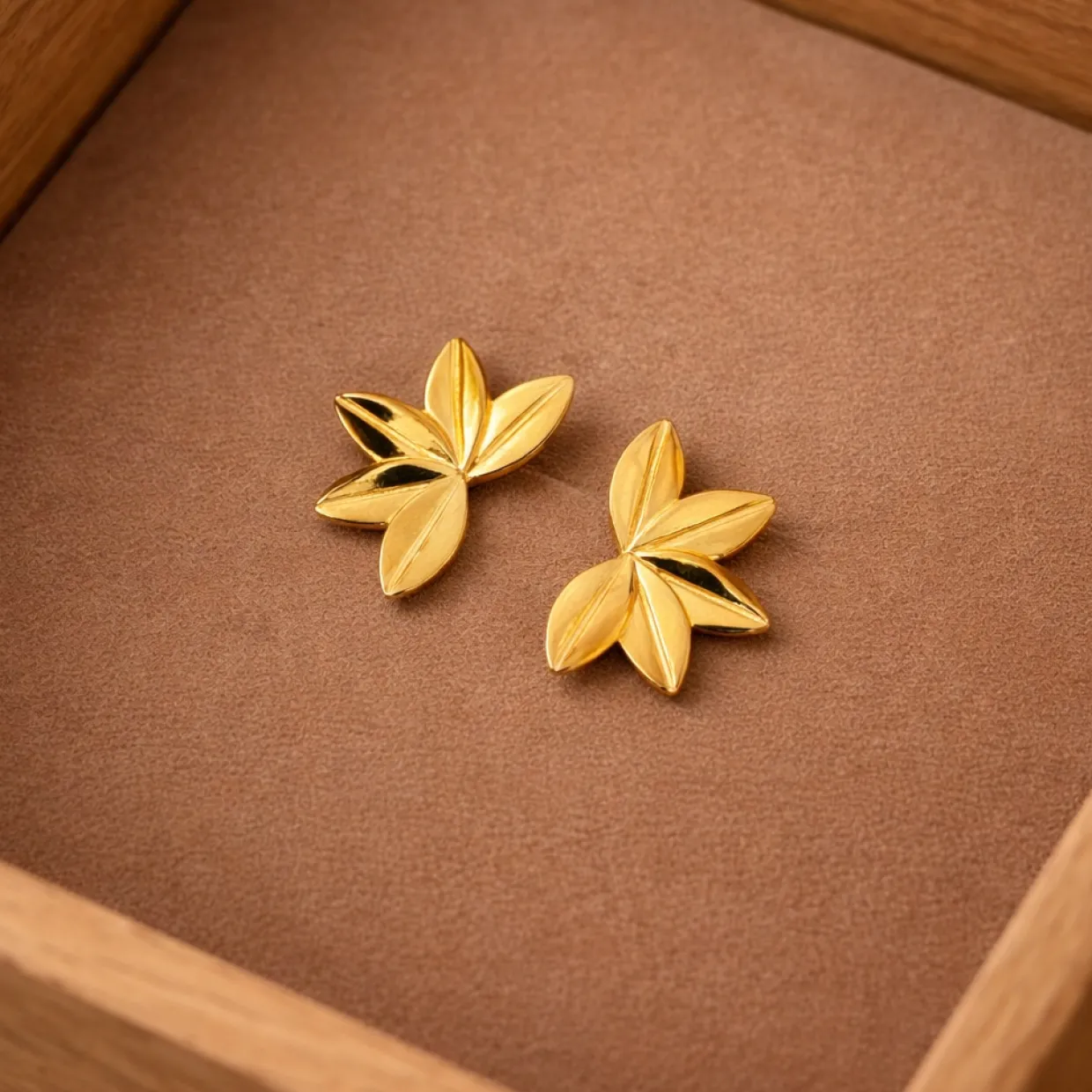 Det delikate blad-design giver øreringene et let og organisk udtryk, mens den varme forgyldning fremhæver detaljerne og skaber en luksuriøs glød. Ørestikkerne er diskrete nok til hverdag, men tilføjer alligevel et elegant blikfang, der løfter ethvert outfit.
