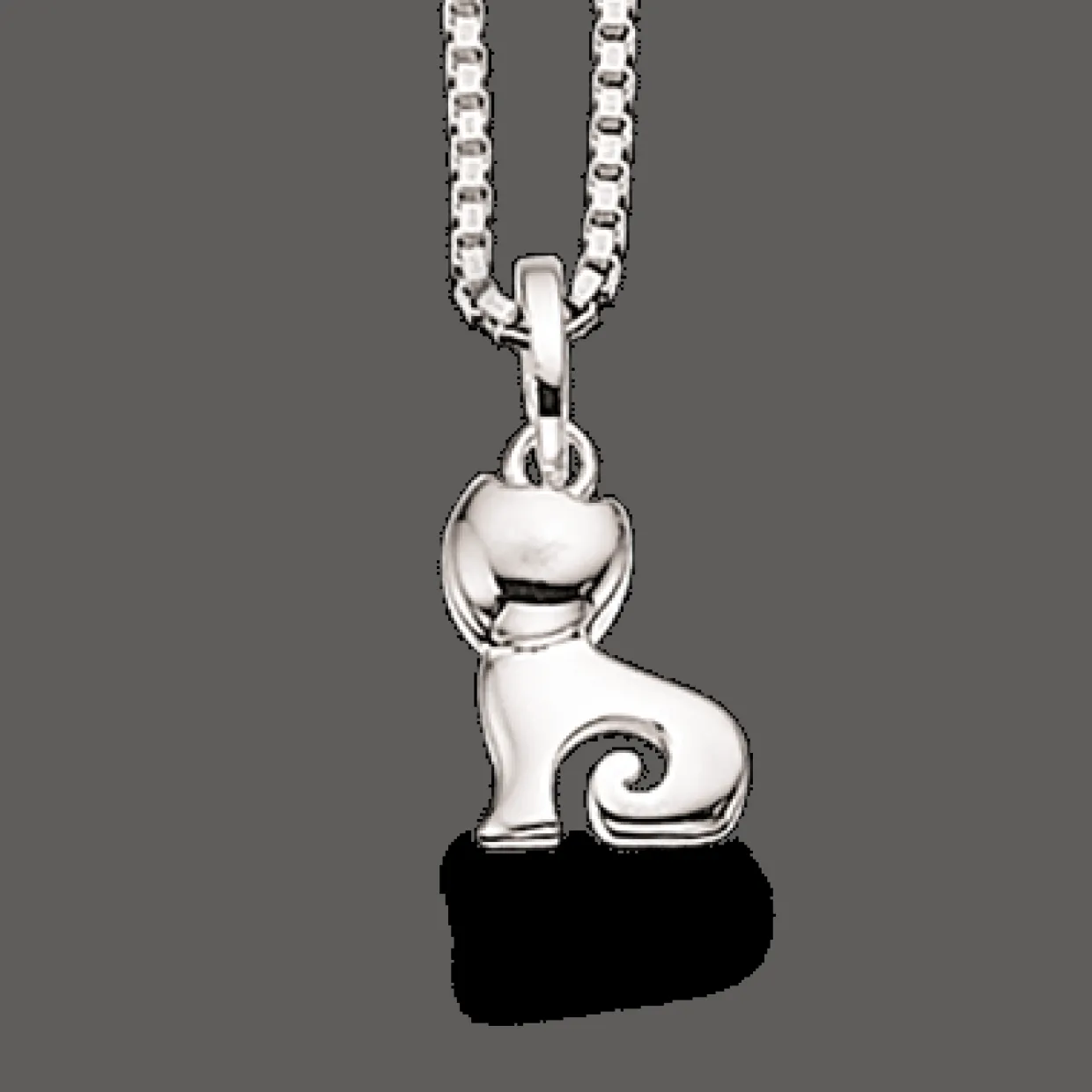 Sølv halskæde med kat. Vedhænget er med blank oveflade og uden sten. Kæden er i mønsteret venezia, som er en firkantet kæde.