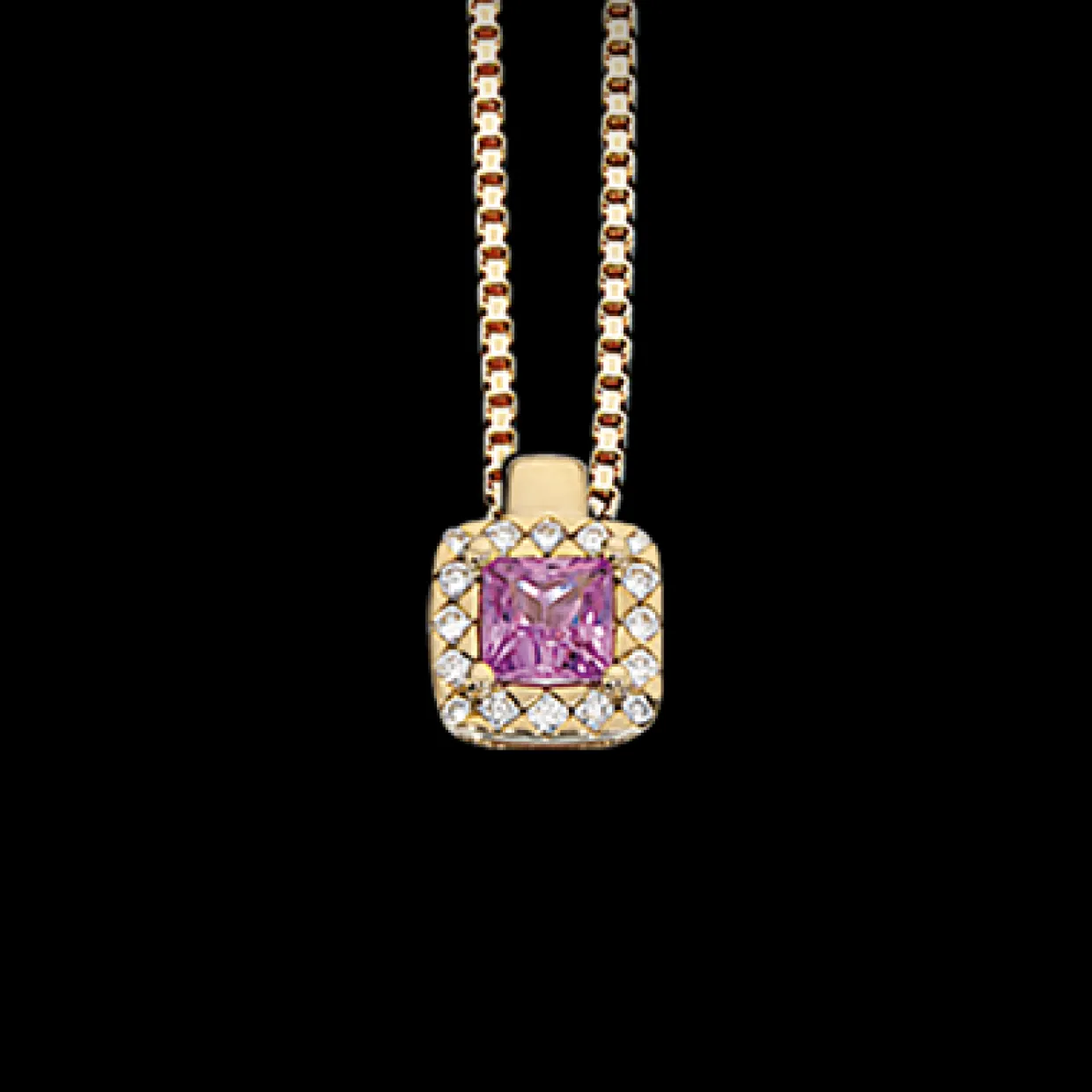 14 karat guld vedhæng med pink safir og brillanter på i alt 0,08 carat i kvaliteten wesselton/si. Til vedhænget medfølger en sølv forgyldt kæde i 45 cm. Kæden kan ombyttes til en anden kæde.