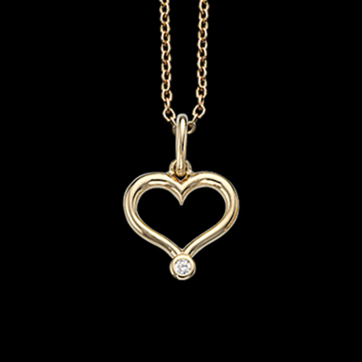 Scrouples 8 karat guld vedhæng som hjerte med syntetisk zirkonia. Kæden er en sølv forgyldt rund anker kæde i 45 cm. Smykket er fint og enkelt og den syntetisk zirkonia sætter lige prikken over iét.