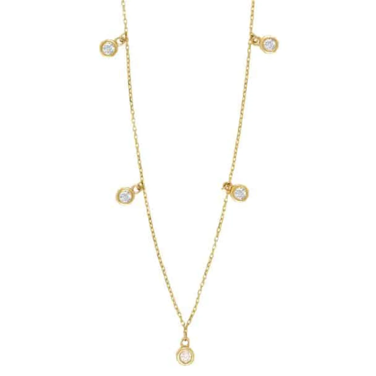 8 karat guld halskæde med 5 syntetiske zirkonia. Kæden er en rund anker kæde på 42+3 cm. De 5 syntetiske zirkonia sidder løse i kæden med rørfatninger.